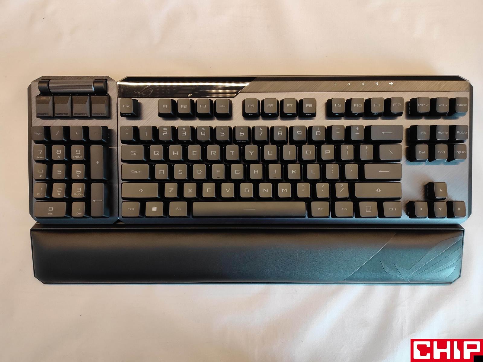 Klawiatura ROG Claymore II jest wielka. Naprawdę wielka, bo mierzy 462 × 155 × 39 cm w swoim pełnym wydaniu, co sprawiło, że początkowo przeżyłem mały szok, jako że na co dzień w pracy sięgam po skromną klawiaturę TKL. Na szczęście ogromne rozmiary nie zostały podyktowane samą chęcią przytłoczenia naszego stanowiska, a upchanie na pokład ROG Claymore II możliwie najwięcej dobra.