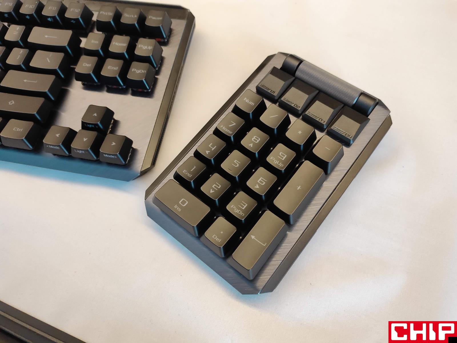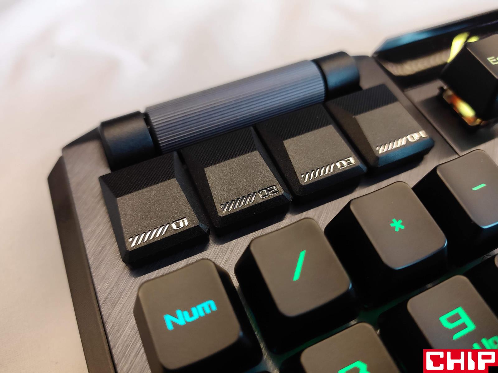 Właśnie tak – dobrze przeczytaliście. Tytułowe trzy klawiatury w jednym są osiągane za sprawą tych dwóch modułów, które możemy łączyć albo po lewej, albo prawej stronie w prosty i szybki sposób. To więc od Was zależy, czy chcecie mieć w swojej klawiaturze blok numeryczny i po której stronie będzie spisywać się najlepiej. Warto jednak nie zostawiać go w pudełku, bo to na nim znalazły się cztery dedykowane przyciski makr z możliwością nagrania kombinacji w czasie rzeczywistym oraz świetna, płynnie działająca rolka do zmiany poziomu systemowego poziomu głośności. Na jego spodzie znajdziemy jedną szeroką nóżkę i dwie podkładki antypoślizgowe.