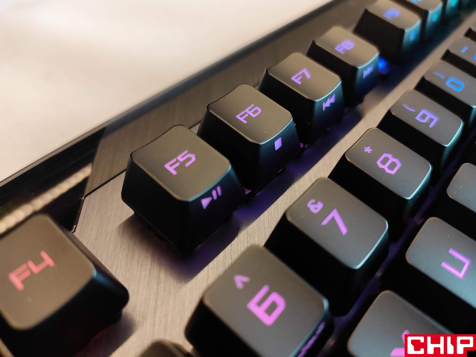 Po pierwsze, diody pod każdym przyciskiem ROG Claymore II zostały wyciągnięte wysoko i same w sobie są jasne i ewidentnie wysokiej jakości, a po drugie same klawisze zostały wykonane w technologii Dual Injection. To sprowadza się do tego, że czcionka została wycięta na tym zewnętrznym klawiszu, a następnie zalana mlecznym tworzywem sztucznym, gwarantując świetną wytrzymałość i dobrej jakości, wyraźną czcionkę. Nawet na boku, bo ASUS zadbał nawet o podświetlenie tych dodatkowych funkcji na dolnych ściankach przycisków.