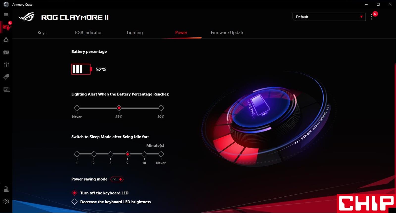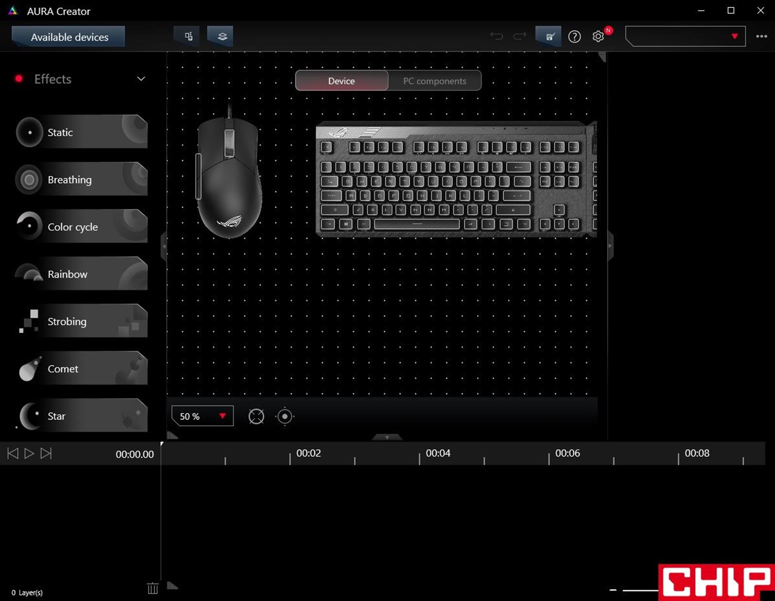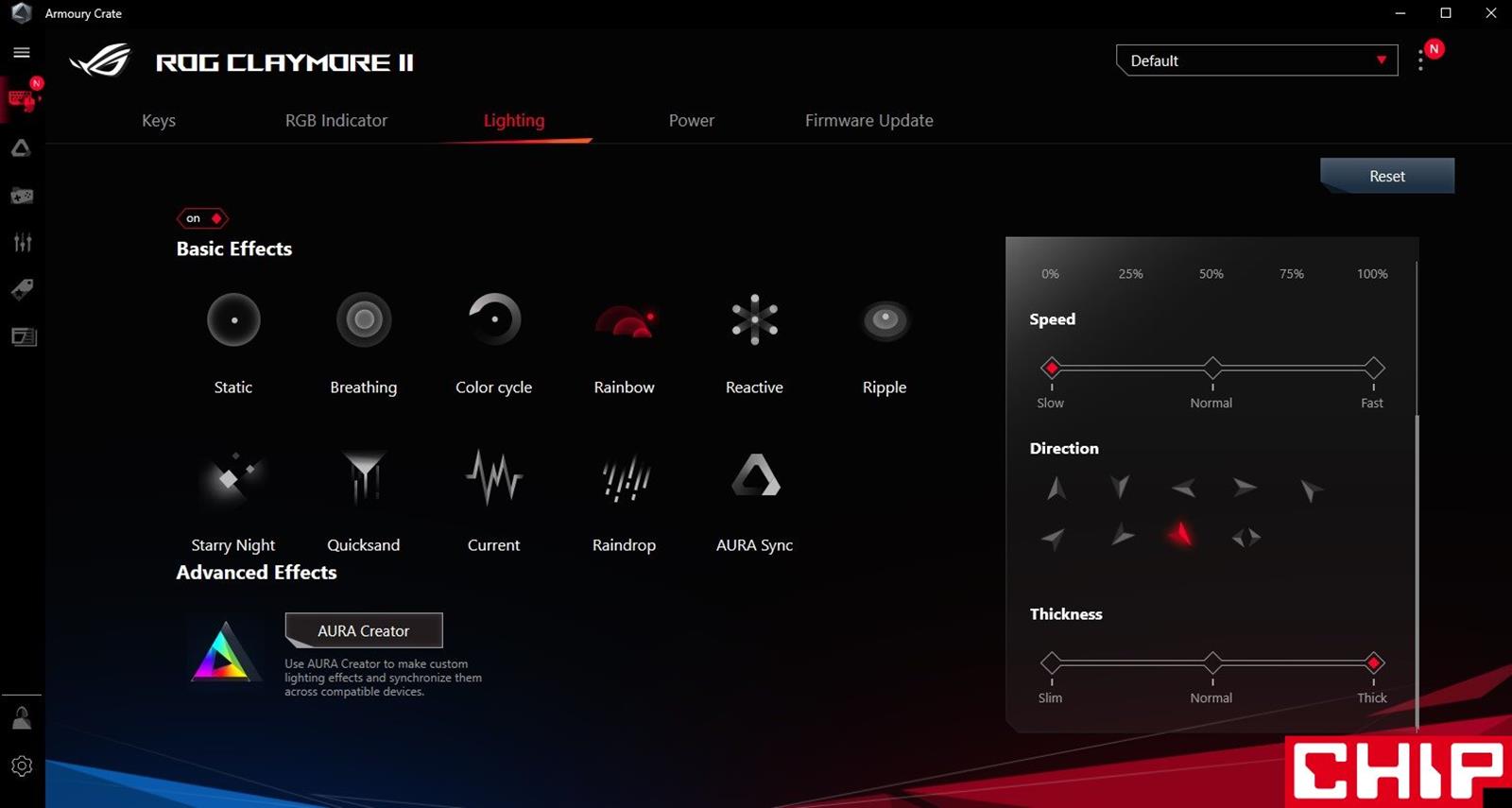 Menu dedykowane już samej klawiaturze pozwala na ustawienie funkcji oszczędzania baterii w trybie bezprzewodowym, podmianę funkcji poszczególnych klawiszy, zaprogramowanie rozbudowanych makr i oczywiście zabawę z podświetleniem wszystkich poszczególnych przycisków razem i z osobna. Na dodatek ROG postarał się też o kreator własnego podświetlenia, choć oczywiście tych fabrycznych jest cała masa z opcją dostosowywania ich jasności oraz częstotliwości. Wśród nich wyróżnia się z kolei ten, podpatrujący obecną temperaturę naszego komputera i zmieniający oświetlenie z zielonego na żółty oraz czerwony wraz z jej wzrostem.