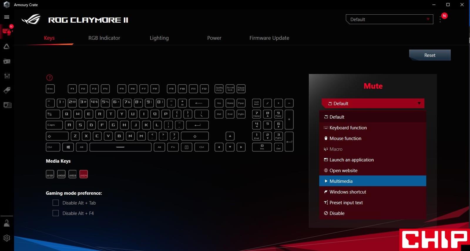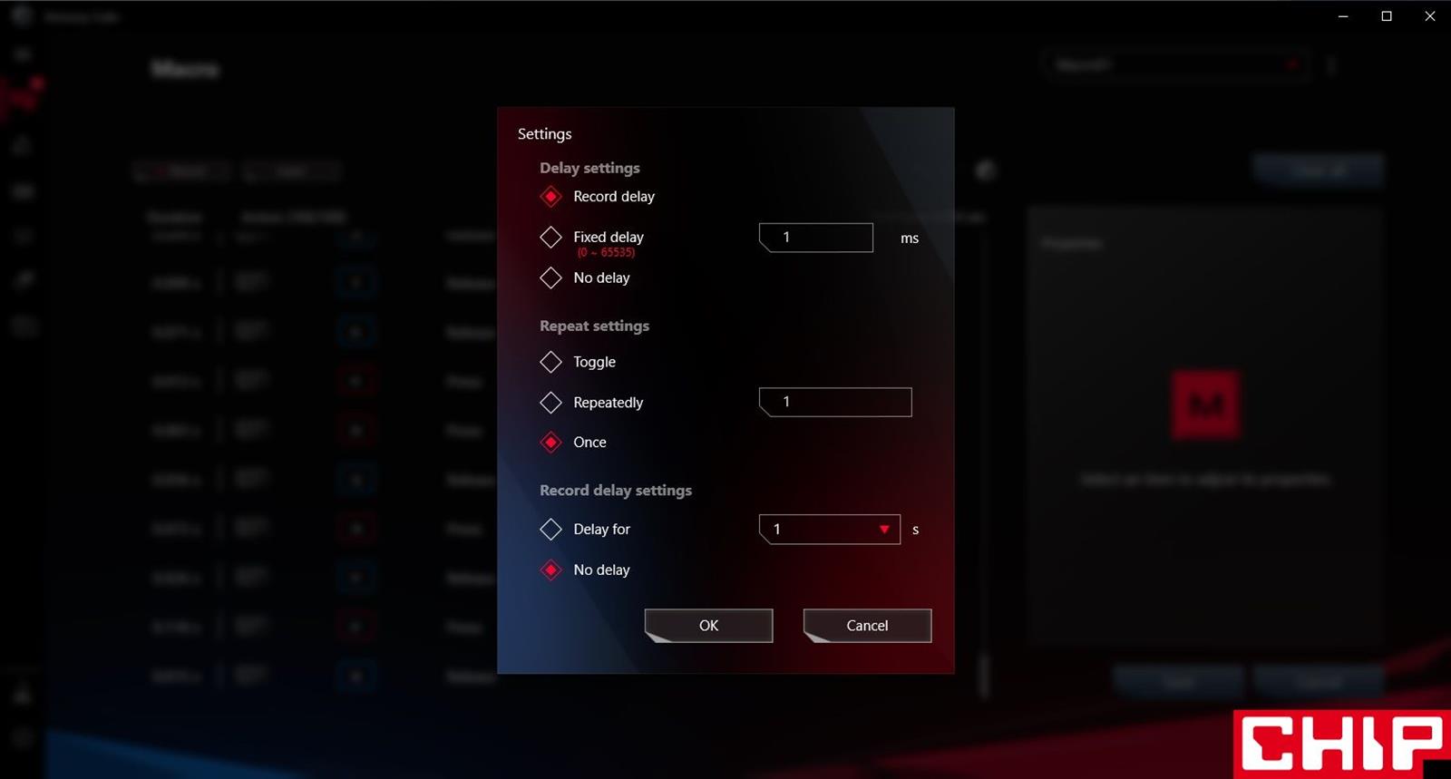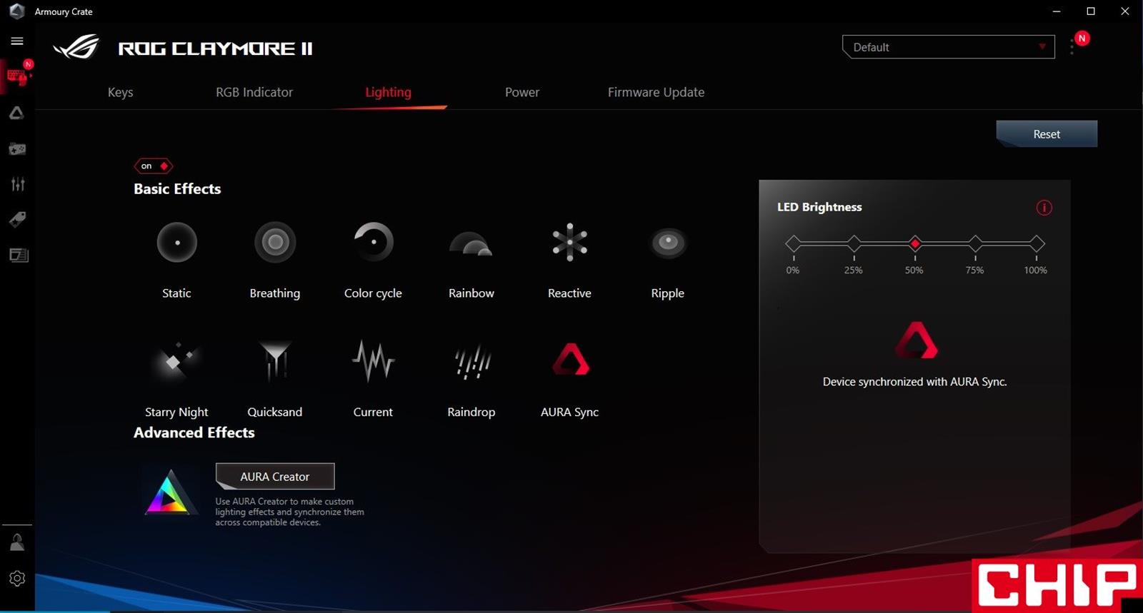 Menu dedykowane już samej klawiaturze pozwala na ustawienie funkcji oszczędzania baterii w trybie bezprzewodowym, podmianę funkcji poszczególnych klawiszy, zaprogramowanie rozbudowanych makr i oczywiście zabawę z podświetleniem wszystkich poszczególnych przycisków razem i z osobna. Na dodatek ROG postarał się też o kreator własnego podświetlenia, choć oczywiście tych fabrycznych jest cała masa z opcją dostosowywania ich jasności oraz częstotliwości. Wśród nich wyróżnia się z kolei ten, podpatrujący obecną temperaturę naszego komputera i zmieniający oświetlenie z zielonego na żółty oraz czerwony wraz z jej wzrostem.