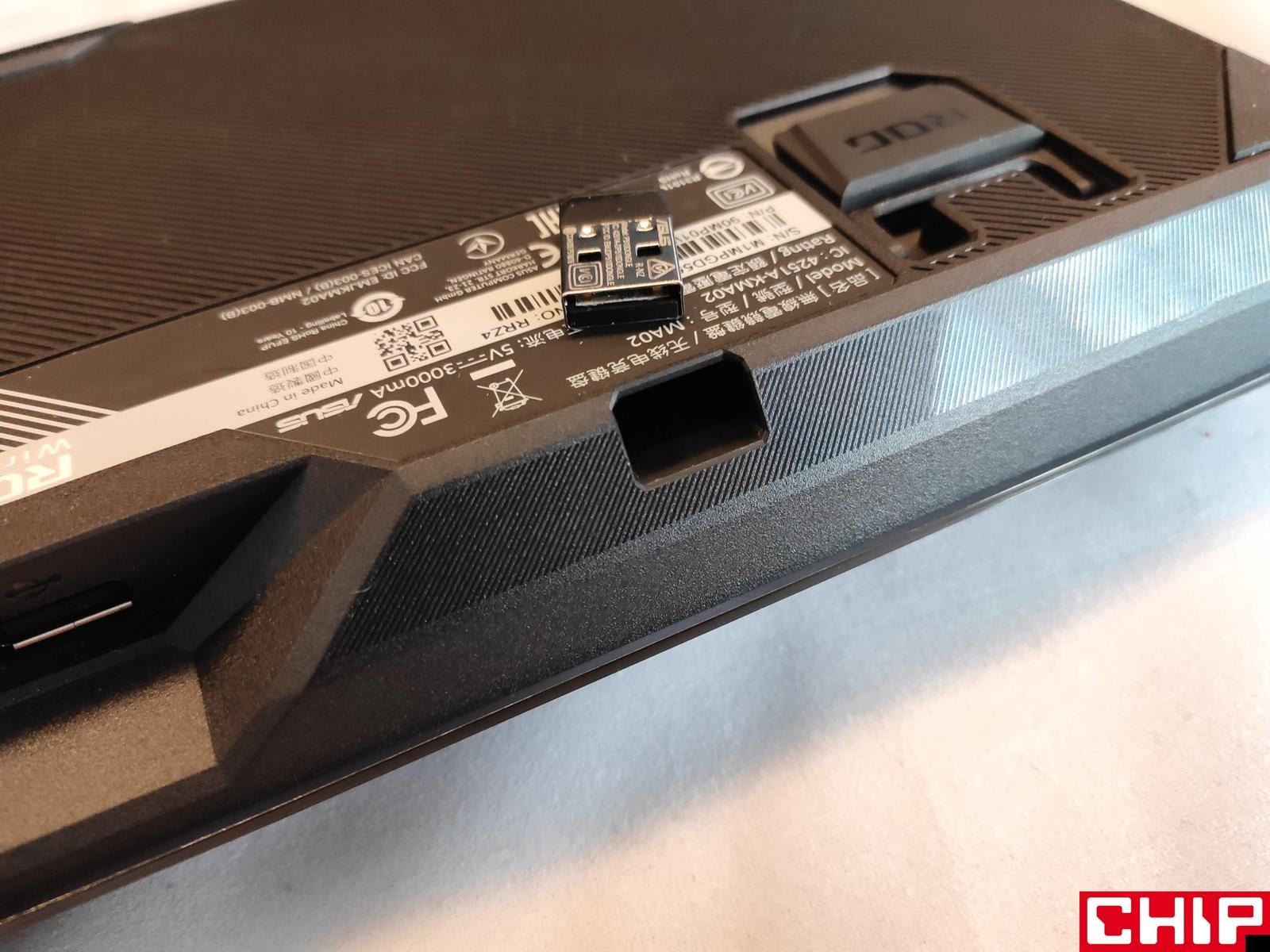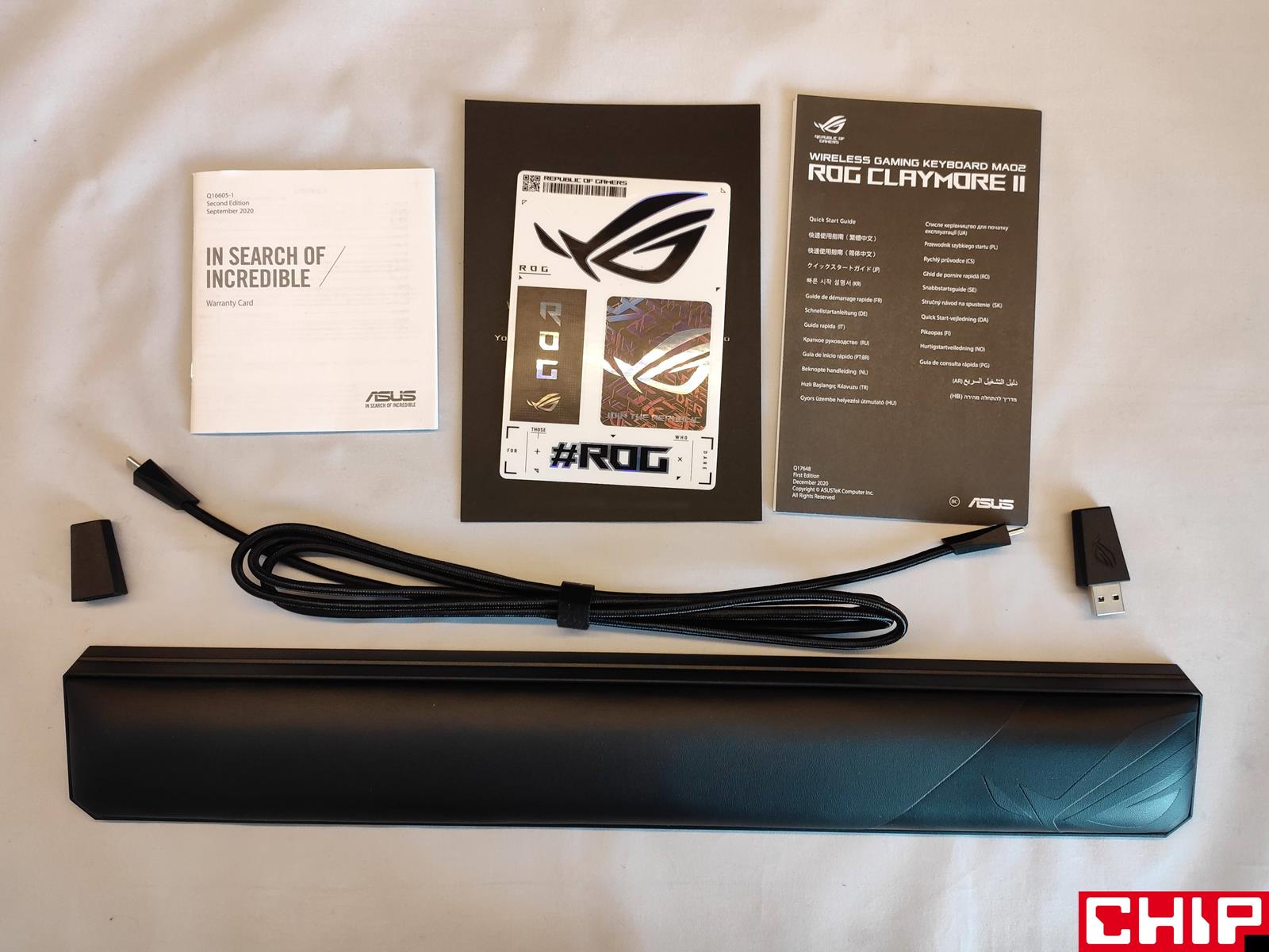 Mowa o podkładce pod nadgarstki, całej masie papierków na czele ze świetnymi naklejkami, przewodzie USB-C do USB-C, przejściówce na USB-A, odbiorniku USB-A i jego rozszerzeniu. Z ROG Claymore II możemy więc korzystać przewodowo, jak i bezprzewodowo, choć samo podejście rozszerzania zasięgu za pośrednictwem przewodu osobiście nigdy mnie nie przekona, jeśli idzie o opóźnienia. Sygnał bowiem nie tylko będzie musiał dostać się do tego extendera bezprzewodowo, ale też następnie trafić do samego komputera już “po przewodzie”.