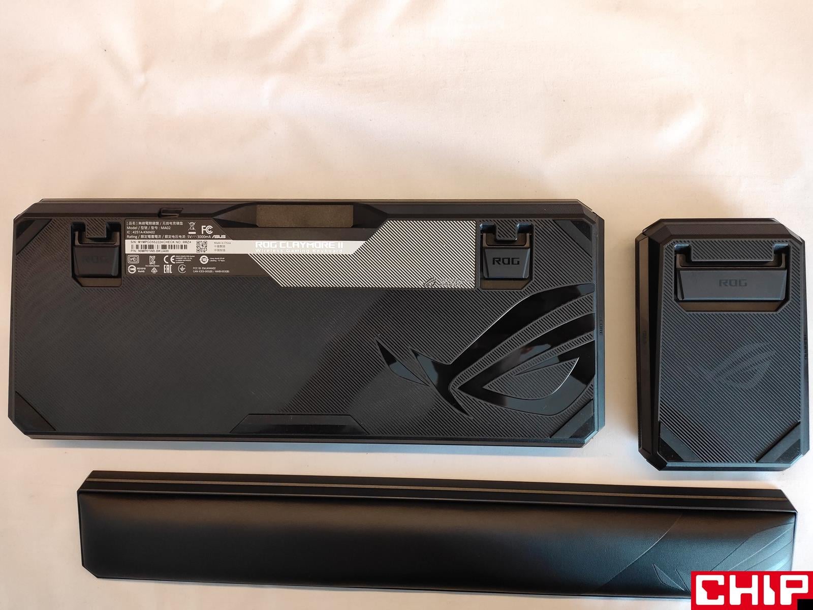 Na spodzie ROG Claymore II pomijając świetnego wykonania i logo producenta, warto wyróżnić tylko szerokie nóżki z gumową osłonką antypoślizgową oraz pięć gumowych podkładek antypoślizgowych. O ile te drugie sprawdzają się świetnie w swoim podstawowym zadaniu, to same nóżki składają się zbyt łatwo, co sprawia, że przez solidną 1156-gramową wagę, łatwo złożyć je przypadkowo, po prostu popychając nieco klawiaturę na biurku.