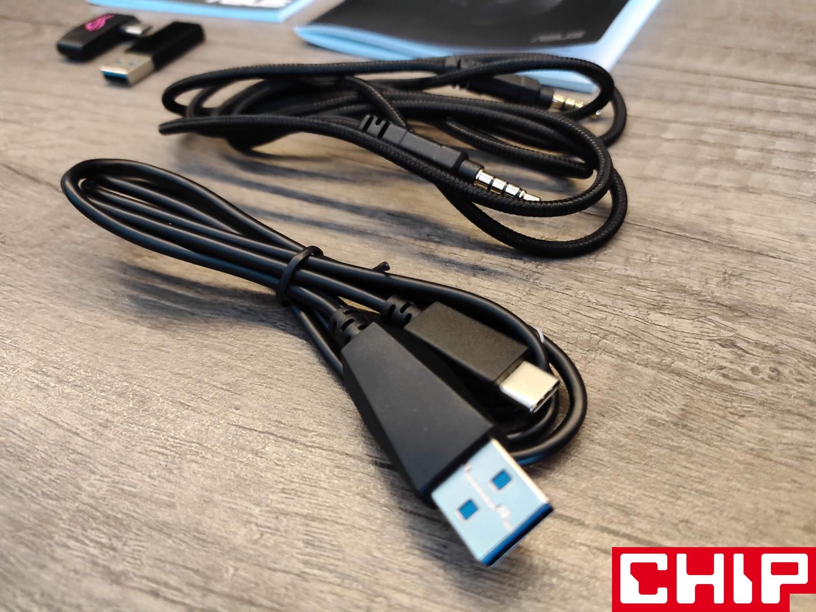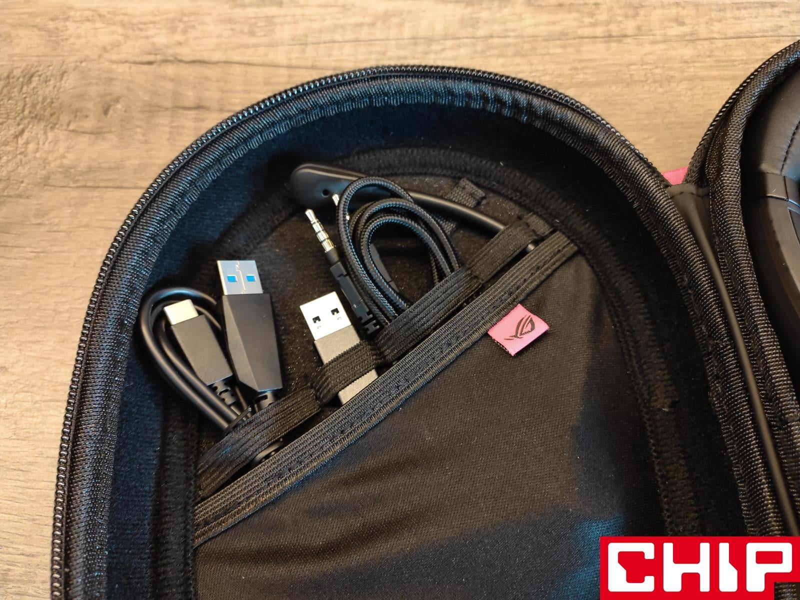 Ładnie zagospodarowane wnętrze sprowadza się do przegródki specjalnie z myślą o słuchawkach oraz najczęściej używanym odbiorniku na USB-C obróconym o 90 stopni. Z drugiej strony gumki trzymają w ryzach gumowy przewód ładujący USB-C o długości 100 cm, odpinany mikrofon na pałąku z najwidoczniej taniego, bo zupełnie prześwitującego plastiku, przejściówka USB-C na USB-A oraz cienki przewód jack 3,5 mm w materiałowym oplocie, mierzący już 120 cm.