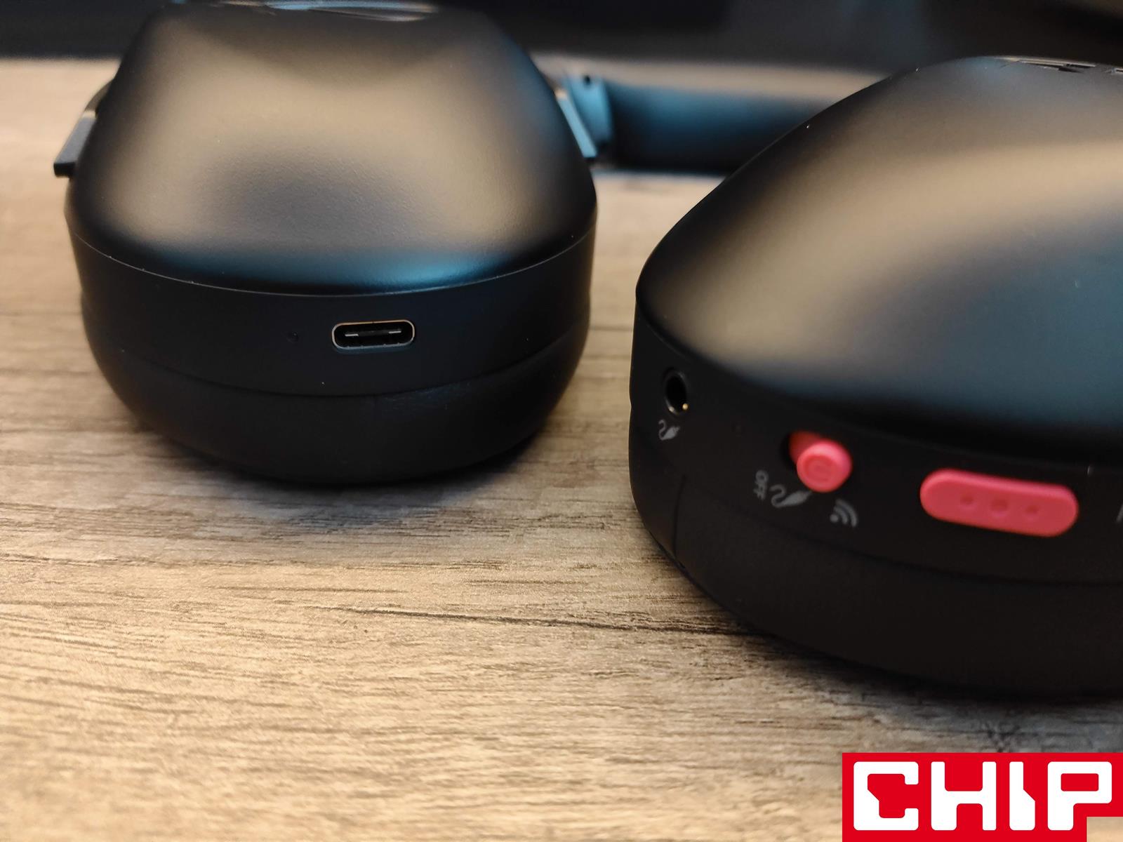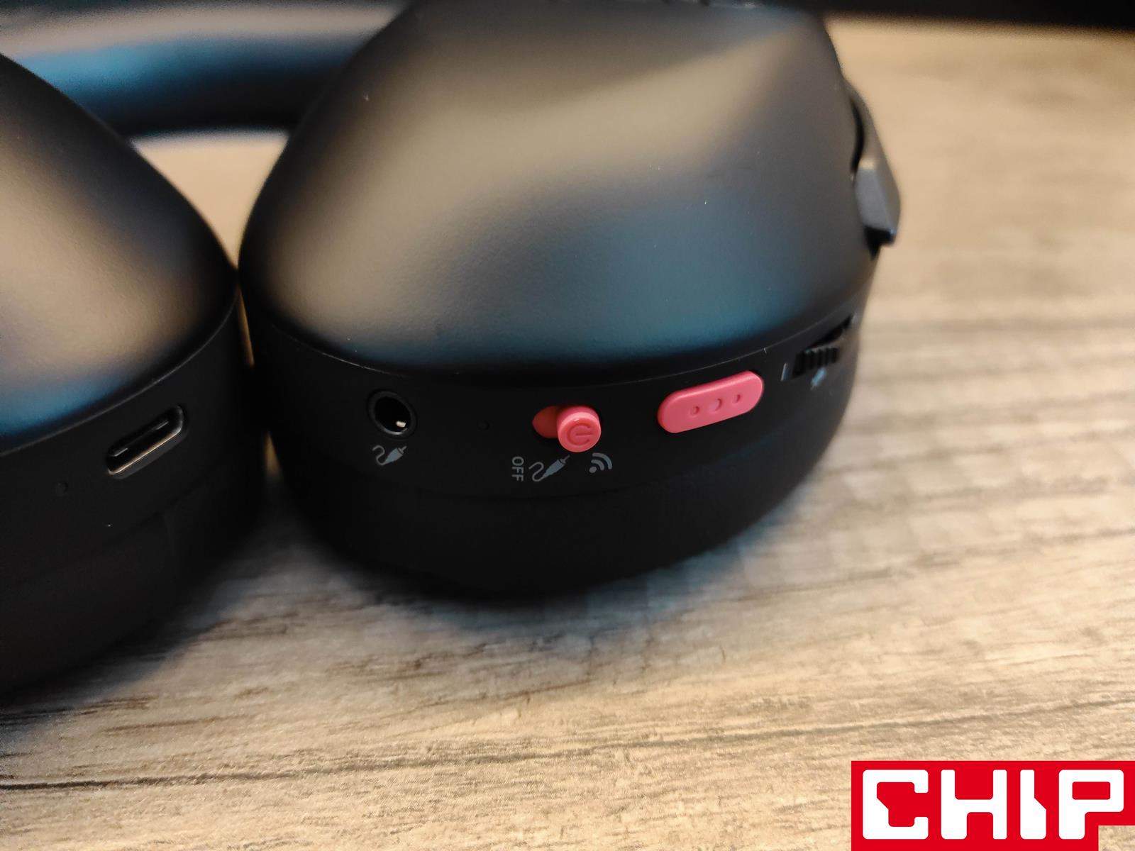 Centrum dowodzenia ROG Strix Go 2.4 Electro Punk znalazło się z kolei na spodzie obu muszli. Na tej lewej znajdziemy wtyk jack 3,5 mm, przełącznik on/off powiązany z wyborem trybu (bezprzewodowego i przewodowego), diodę i przycisk funkcyjny, regulację poziomu głośności z aktywacją/dezaktywacją mikrofonu po naciśnięciu, ukryty mikrofon oraz port na ten główny, odpinany. Na spodzie prawej muszli swoje miejsce zagrzał port USB-C do ładowania wbudowanej baterii z powiązaną diodą. Wszystko to działa sprawnie i nie budzi wątpliwości co do trwałości.