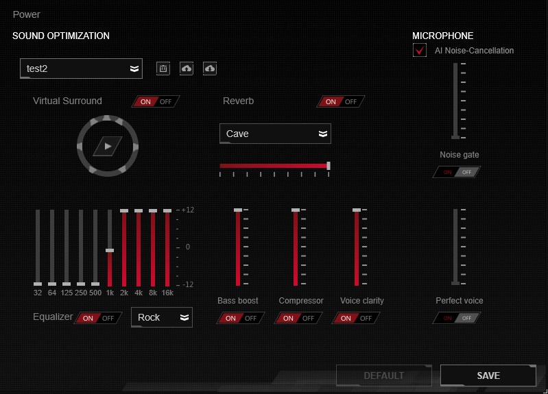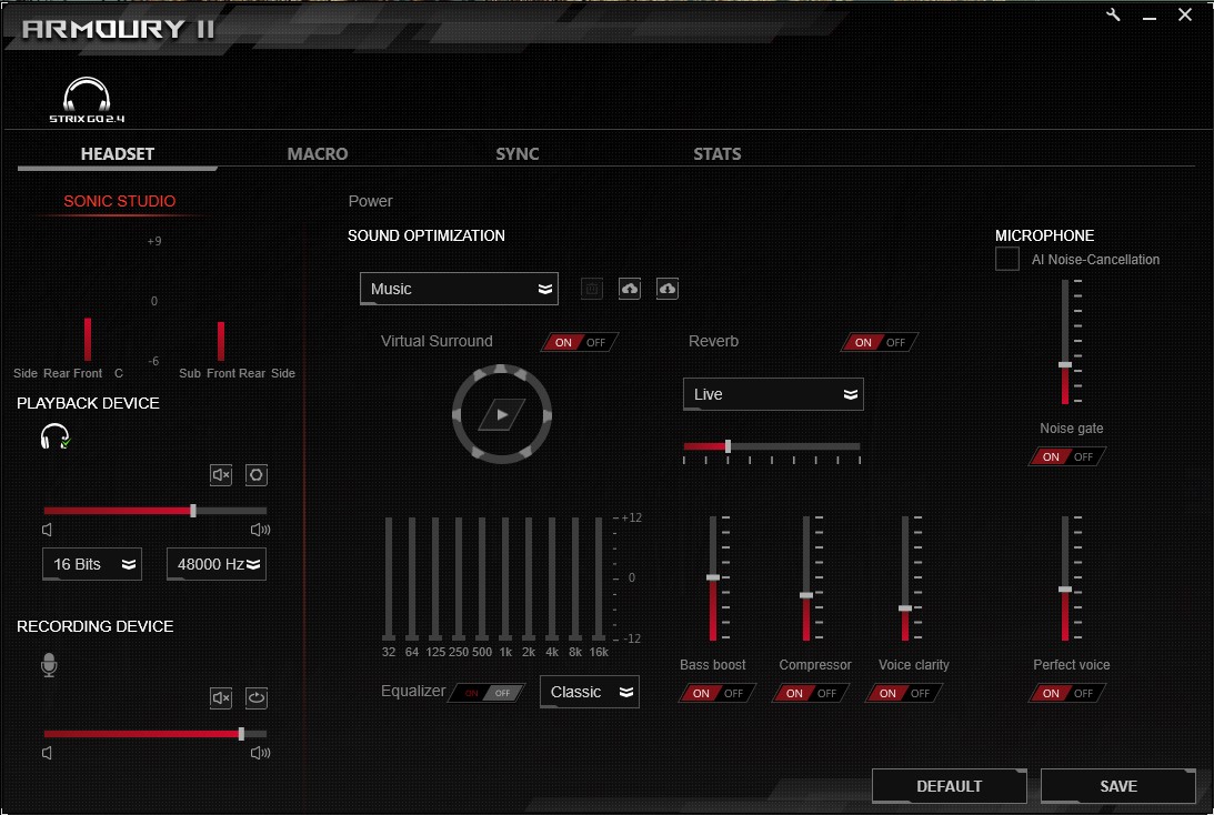 Jeśli już jednak dorwiecie się do Armoury II, to ujrzycie solidne wyposażenie, jako że w opcjach nie zabrakło predefiniowanych profili, aktywacji/dezaktywacji wirtualnego trybu 7.1, prostego equalizera, opcji wzmocnienia basów, uszlachetnienia wokali i wreszcie dodatków do mikrofonu.