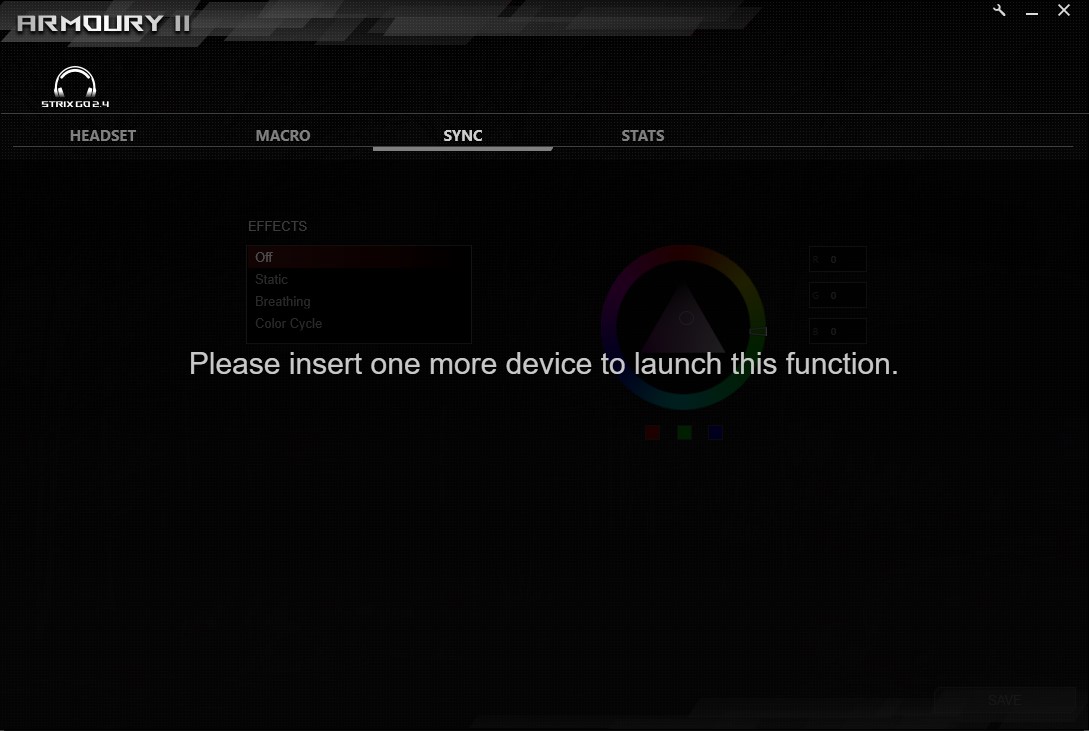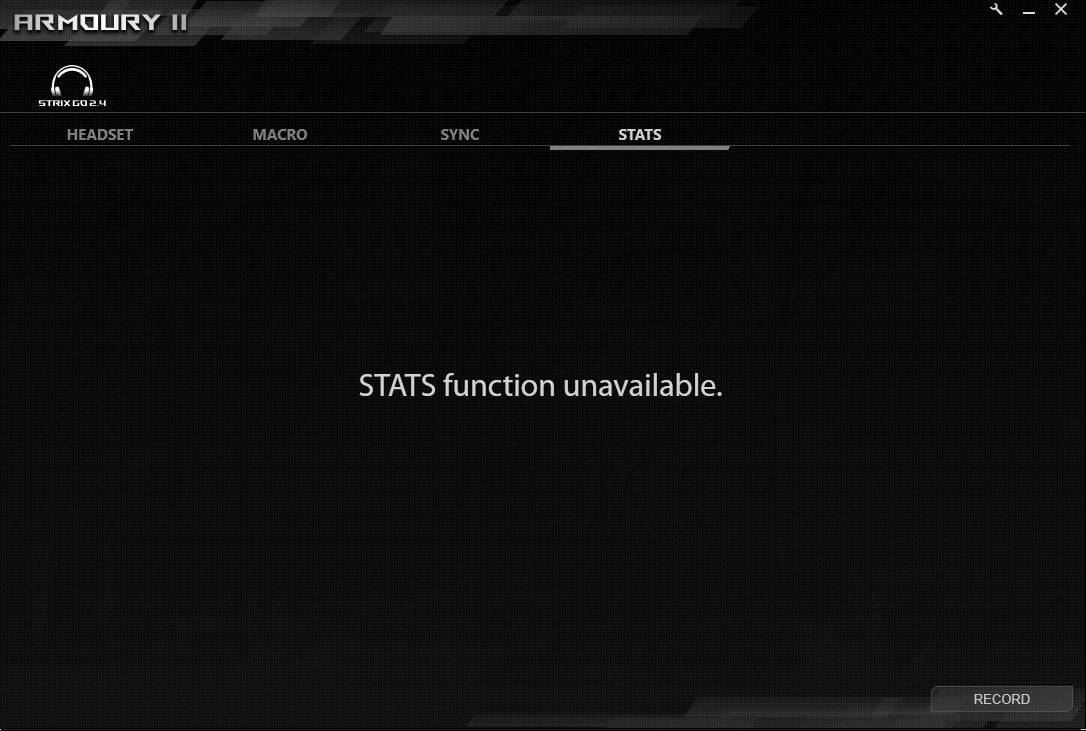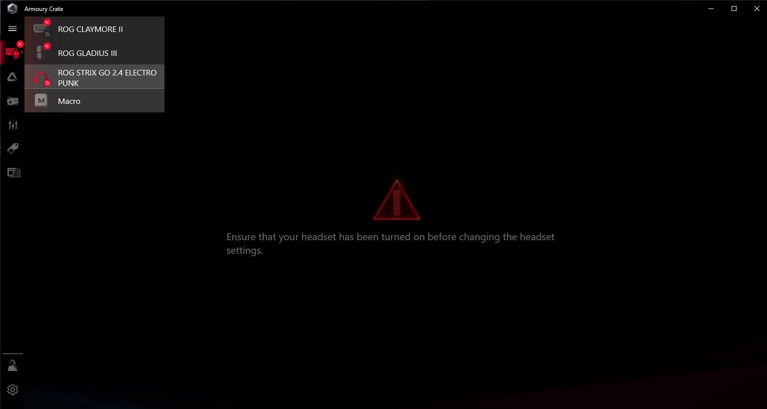 Chociaż ROG Strix Go 2.4 Electro Punk posiadają natywne wsparcie dla oprogramowania Armoury II, to niestety skorzystanie z niego było w moim przypadku niemożliwe na trzech różnych platformach. Jedna sprzętu w ogóle nie rozpoznawała, a przy dwóch innych przejście “dalej” do opcji blokował taki ekran: