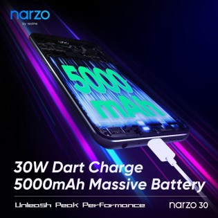 Ponadto urządzenie posiada baterię o pojemności 5000 mAh z obsługą ładowania o mocy 30 W, która według zapowiedzi ma naładować nam smartfon od zera do 50 procent w ciągu 25 minut. Narzo 30 jest wyposażony również w 6,5-calowy wyświetlacz LCD Full HD+ z częstotliwością odświeżania 90 Hz i zamontowany z boku czytnik linii papilarnych, podczas gdy na jego dolnej krawędzi znajdzie się wejście jack 3,5 mm. Jeśli chodzi o opcje kolorystyczne, to według udostępnionych zdjęć przez Realme, wybór ograniczy się do dwóch kolorów.
