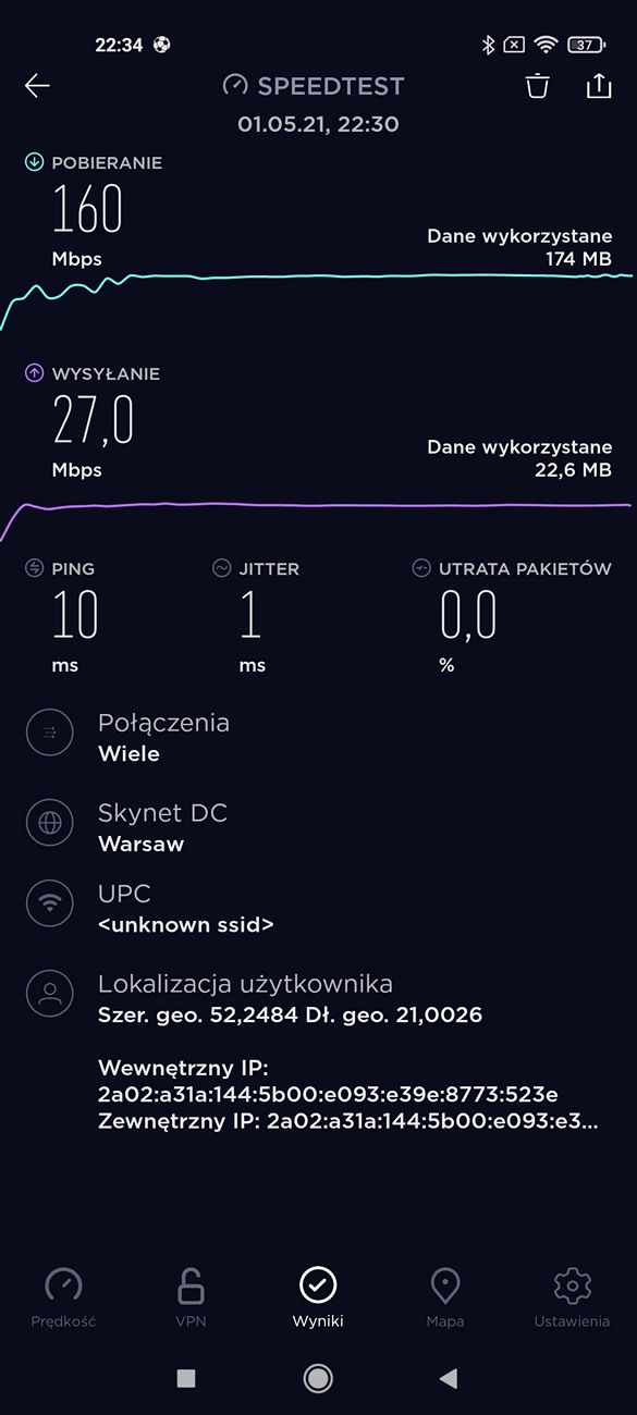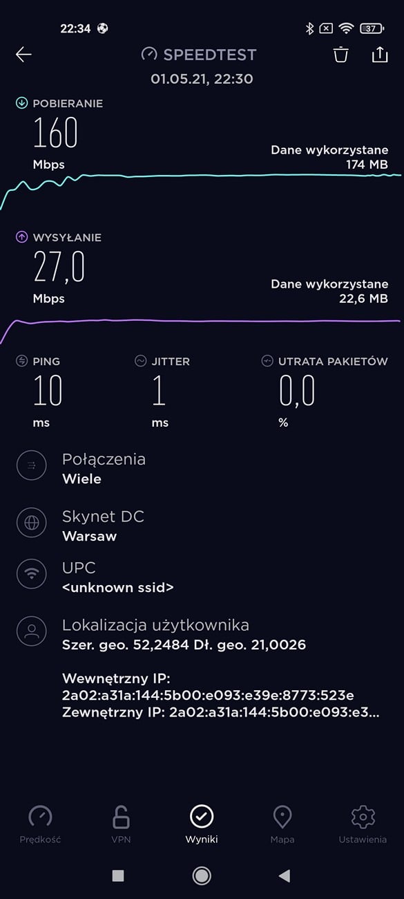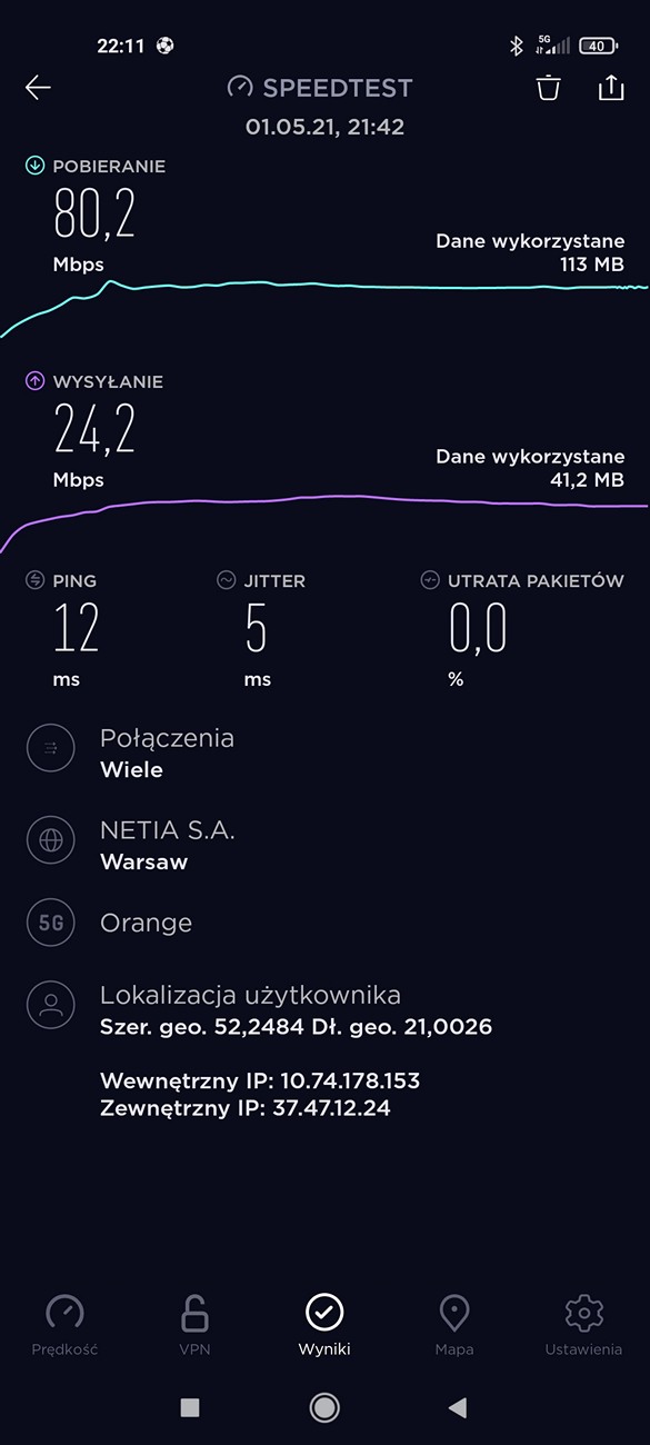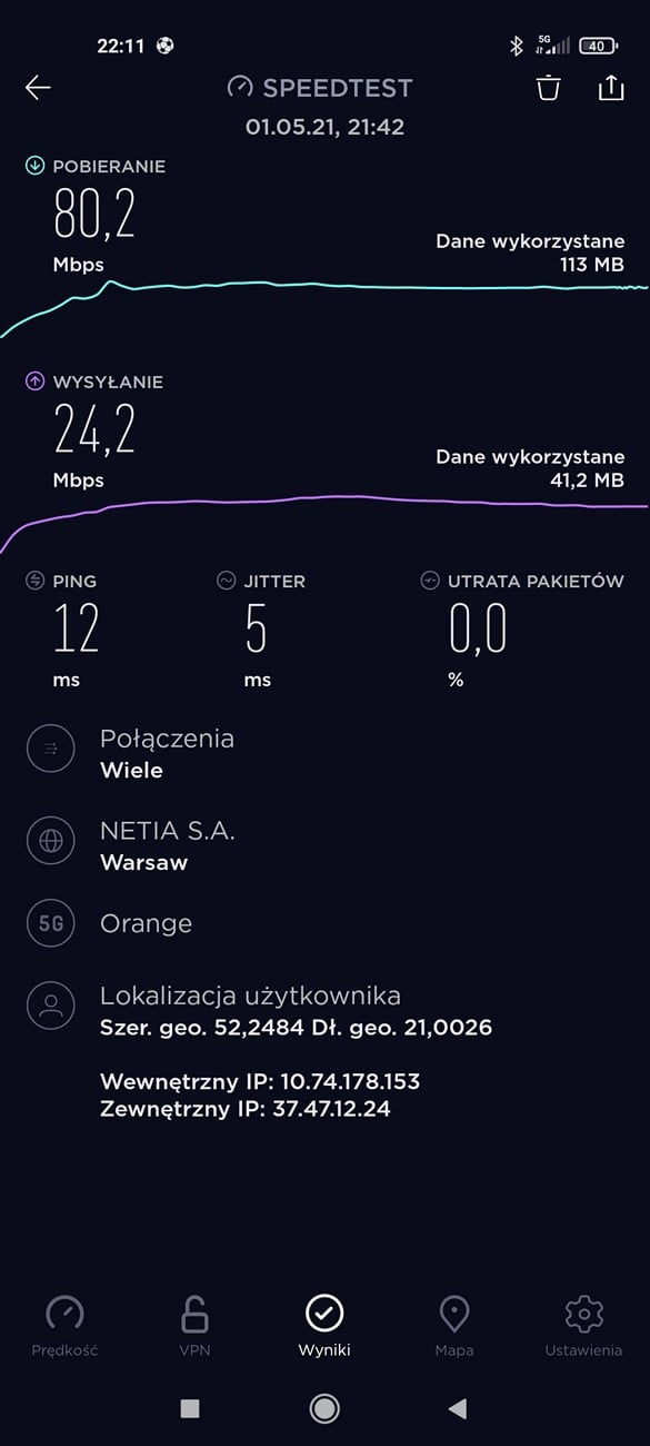 Kontynuując test Xiaomi Mi 11 Ultra chodzimy do kwestii komunikacyjnych. Telefon jest Dual-Simem, z dwoma slotami na fizyczne karty nano. Jakość połączeń głosowych przez cały okres trwania testów była bardzo dobra – nie mam tu zastrzeżeń. Smartfon obsługuje sieci 5G i to u wszystkich operatorów. Prędkość w Warszawie, w sieci Orange prezentowała się przyzwoicie, ale szału nie było – 80,2 Mb/s pobieranie i 24,2 Mb/s w przypadku wysyłania danych. Oczywiście, nie będąc w zasięgu 5G, możemy skorzystać z LTE lub Wi-Fi 6. Nie odnotowałem najmniejszych problemów podczas trwania testów. Sieć UPC w Warszawie oferowała 160 Mb/s pobieranie i 27,2 Mb/s – wysyłanie danych.
