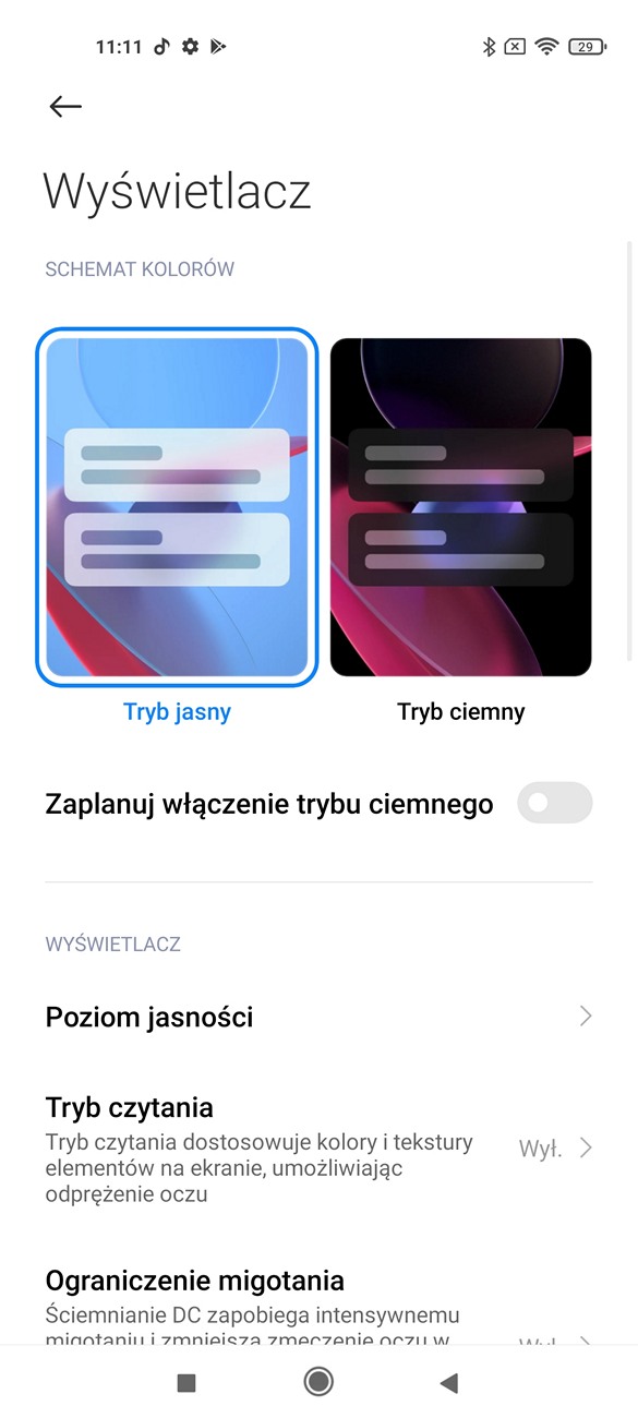 W ustawieniach możemy zmniejszyć rozdzielczość do 2400 x 1080, a częstotliwość odświeżania do 60 Hz w celu wydłużenia czasu pracy na baterii. Ponadto znajdziemy tam jeszcze filtr światła niebieskiego, tryb ciemny dla menu, funkcję ograniczania migotania ekranu w warunkach słabego oświetlenia oraz możliwość regulacji nasycenia barw. Ta ostatnia opcja jest bardzo rozbudowana i obejmuje również temperaturę barwową, odcienie i predefiniowane ustawienia.