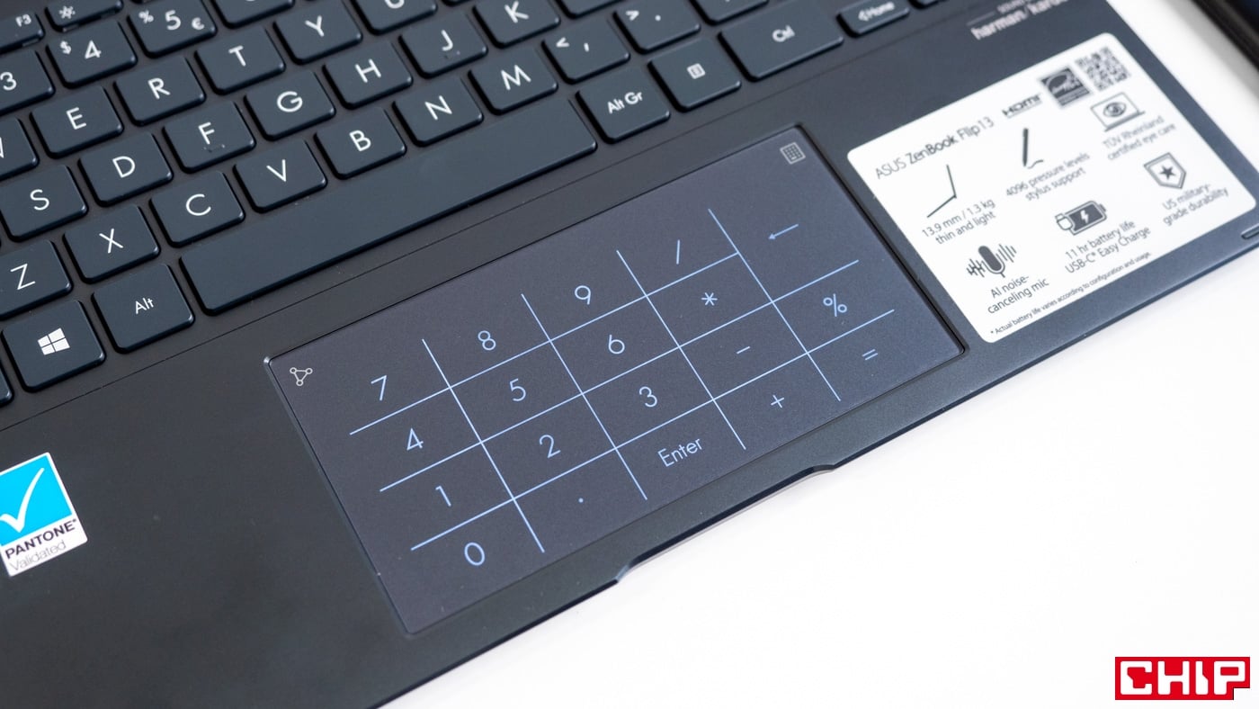 Touchpad wygląda nieco dziwnie, bo jest stosunkowo niski i długi. Płytka dotykowa jest odpowiednio śliska i wygodnie się z niej korzysta. Jest na niej wyświetlana klawiatura numeryczna. Wystarczy przytrzymać pole w rogu touchpada. Dotykowe przyciski z cyferkami nie będą wygodne dla osób, które na co dzień operują tabelami w Excelu, ale jeśli od czasu do czasu potrzebujemy z niej skorzystać to jest to ciekawa opcja.