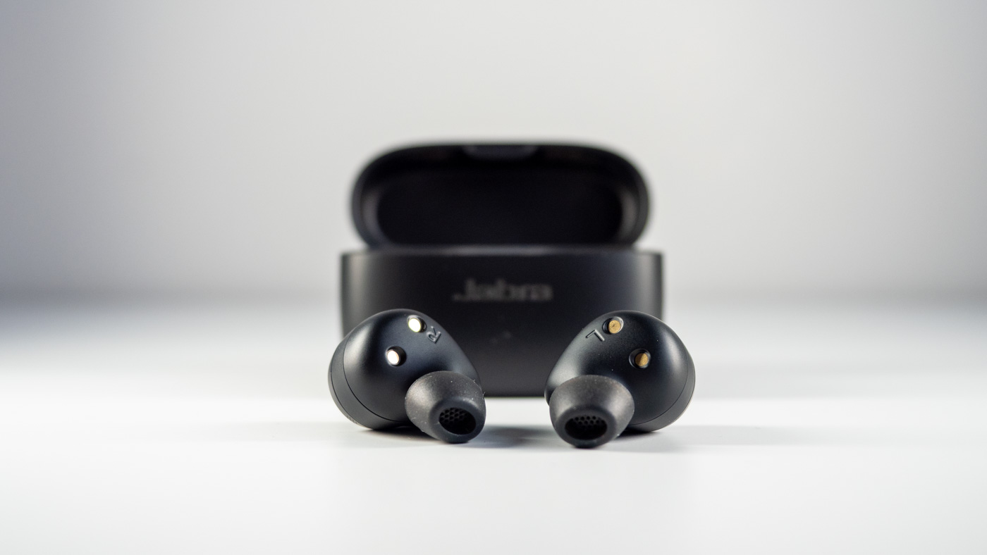 Przechodząc do samych słuchawek, ponownie między tymi modelami widać znaczne podobieństwo samej konstrukcji. Zarówno Momentum True Wireless 2, jak i Elite 85t wyglądają podobnie pod kątem konstrukcji i posiadają ustawioną pod kątem sekcję z gumką, którą wkładamy do kanału słuchowego. Ten kąt jest okazalszy w grubszych, bardziej wystających słuchawkach Jabra, gdzie na dodatek kształt tej wspomnianej sekcji jest nie okrągły, a elipsowaty. Ich wyposażenie ze strony wewnętrznej jest z kolei bardziej eleganckie, sprowadzając się tylko do dwóch styków ładujących, a nie czterech styków, ładujących, widocznych magnesów i czujnika.