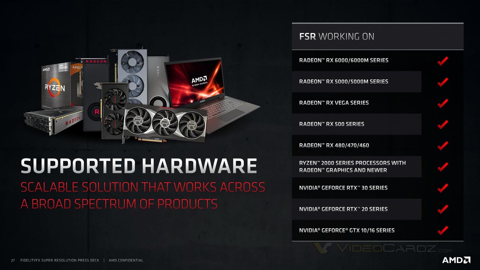Co kluczowe, FidelityFX Super Resolution działa nie tylko na kartach AMD od serii Radeon RX 400 wzwyż, ale też na zintegrowanych rdzeniach w Ryzen 2000, a nawet kartach graficznych GeForce od GTX 1000 do RTX 3000.