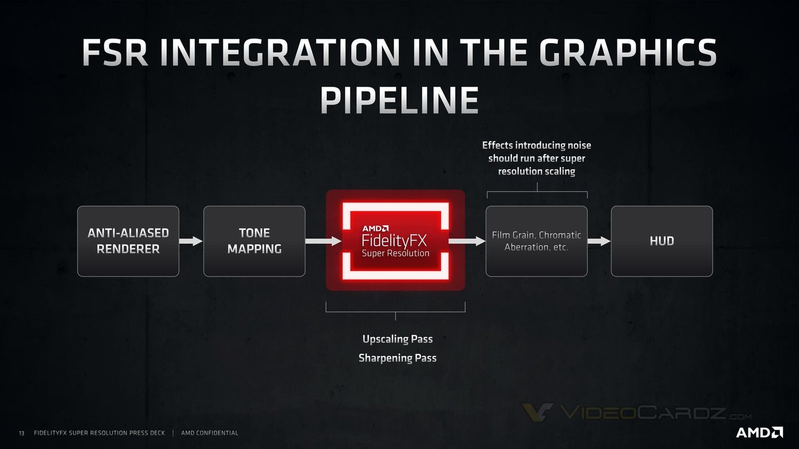 AMD, zamiast bazować na sztucznej inteligencji, postawiło na “najnowocześniejsze algorytmy”, które analizują grafikę w celu wykrycia krawędzi i rekonstruują ją w wysokiej rozdzielczości. FSR działa w środku potoku graficznego, czyli po zadziałaniu wygładzeń krawędzi i mapowaniu kolorystyki, dlatego też jego implementacja ma miejsce przed dodaniem jakichkolwiek filtrów.