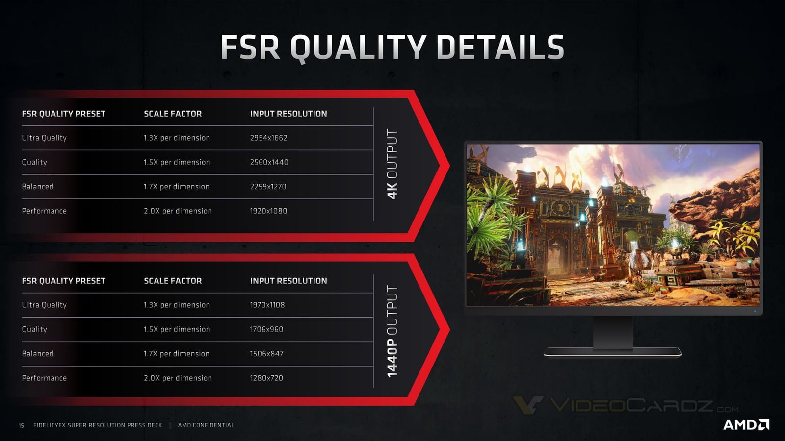 W grach FidelityFX Super Resolution będzie dostępne w czterech ustawieniach: Performance, Balanced, Quality i Ultra Quality, a skuteczność każdego z tych profili jest zależna od wyjściowej rozdzielczości. W porównaniu z DLSS od NVIDIA, skalowanie zachodzi od poziomu 1,3 do 2 razy (dla FSR) względem 1,5 do 3 razy (DLSS). Oznacza to tyle, że AMD skaluje najlepszej jakości obraz z wyższej rozdzielczości, a NVIDIA ten nastawiony na płynność ze znacznie niższej, bo trzykrotnej, a nie dwukrotnej.