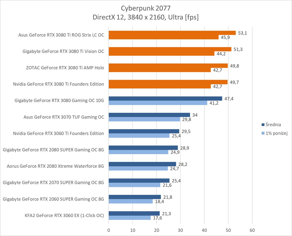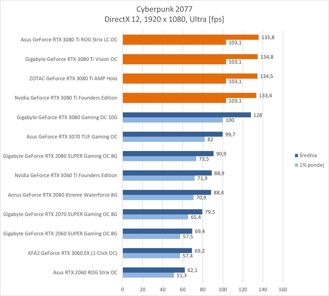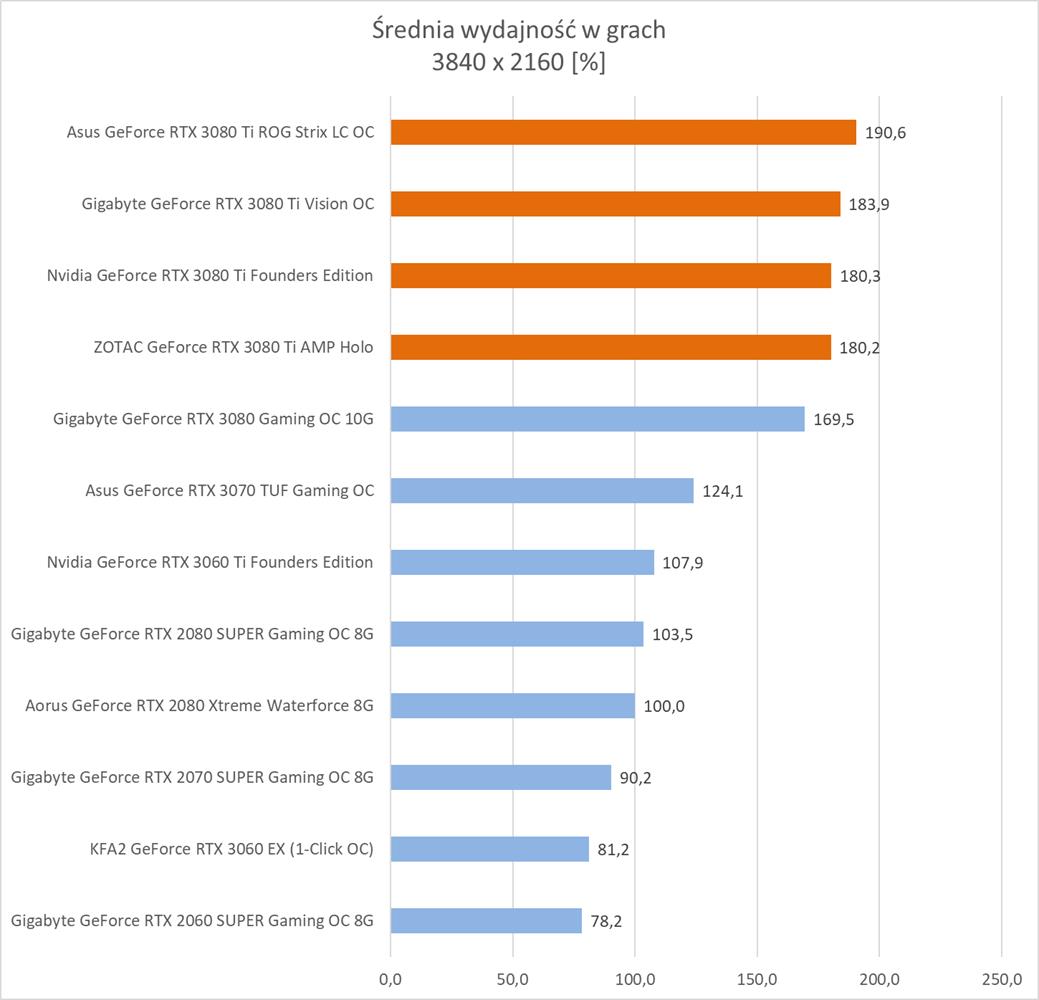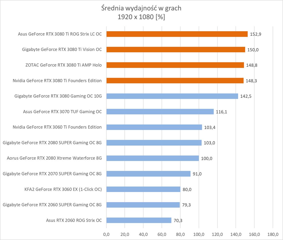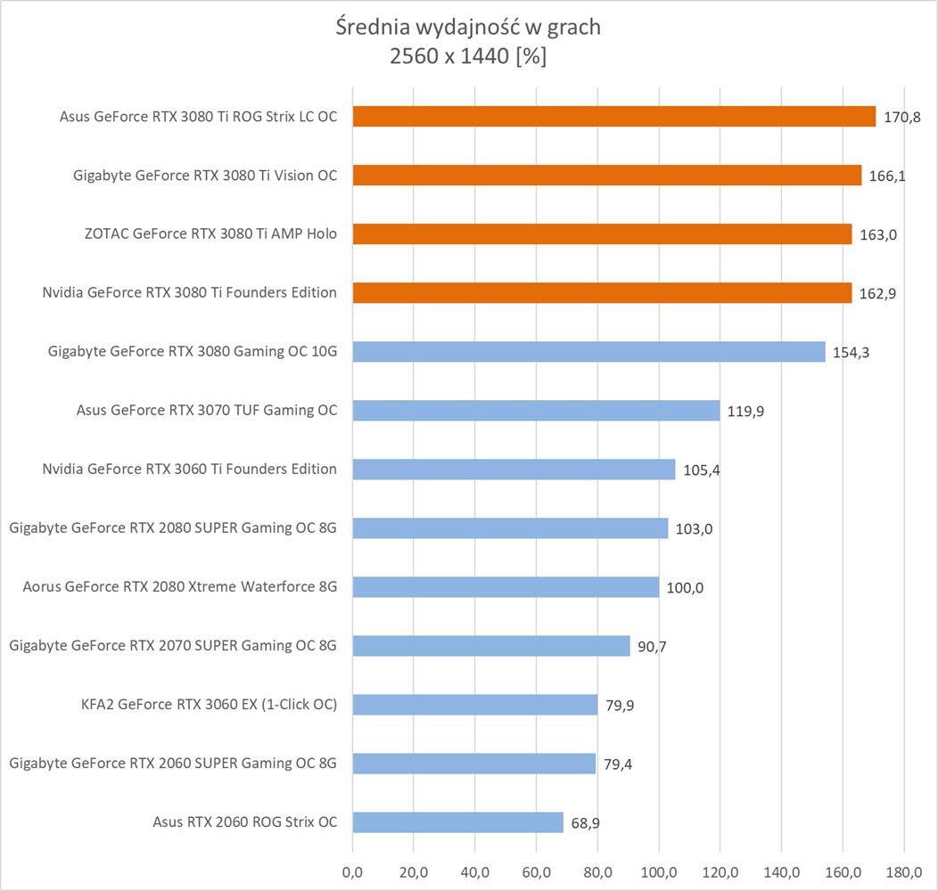 Średnia wydajność testowanych modeli GeForce RTX 3080 Ti