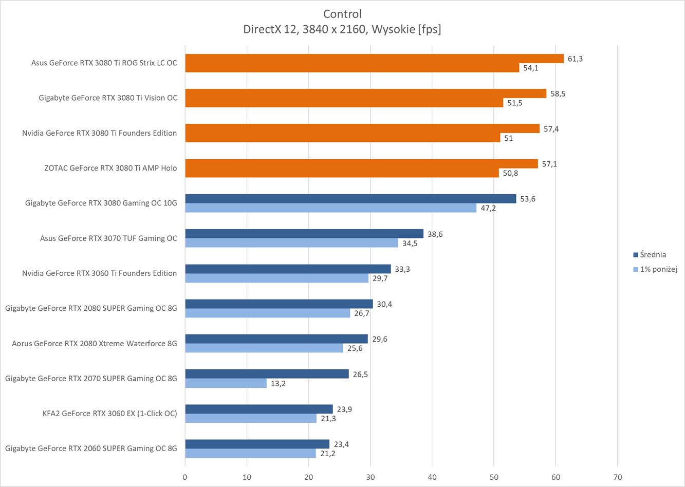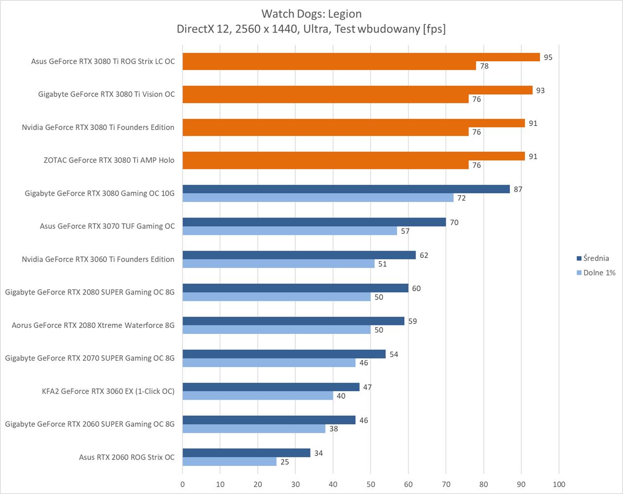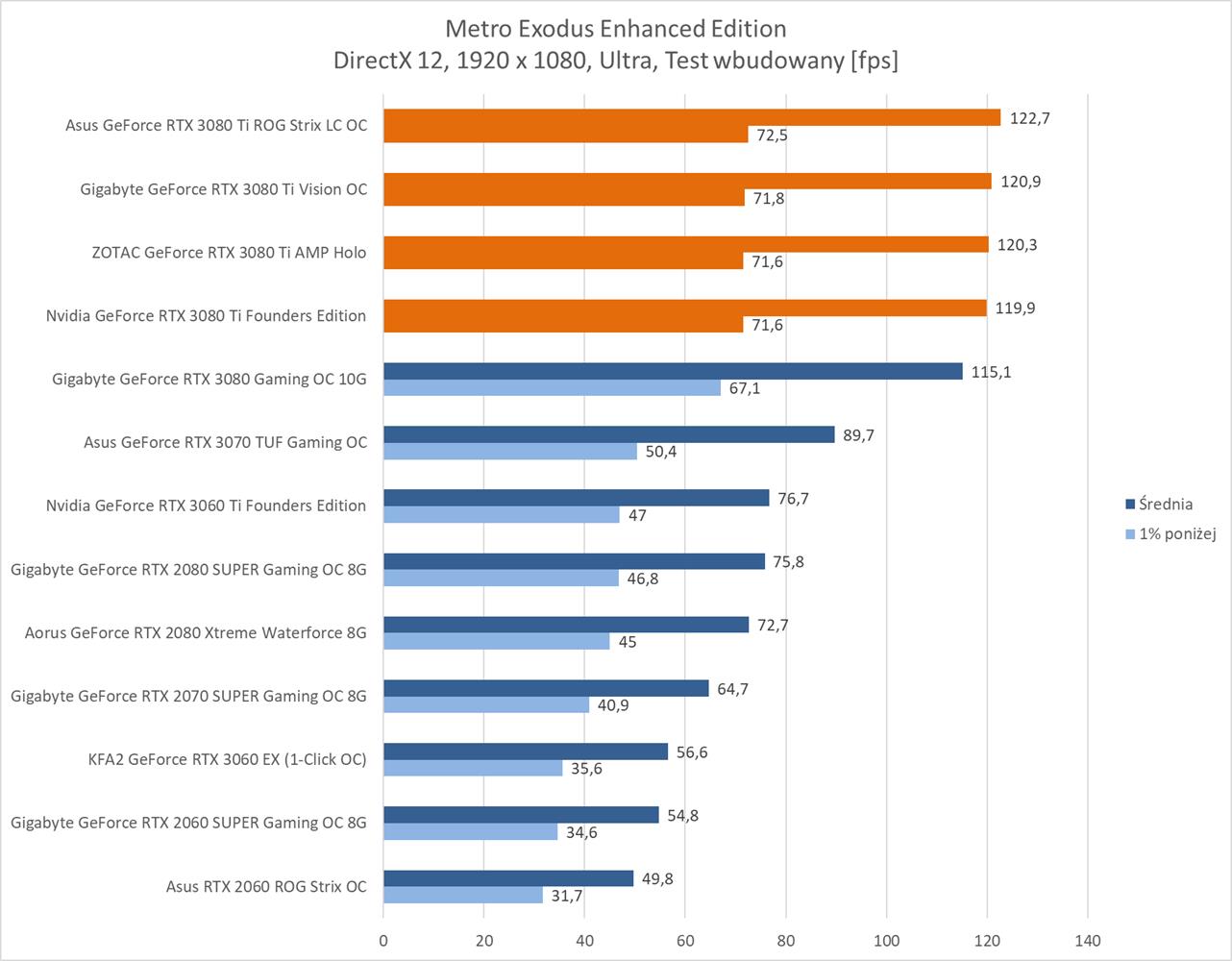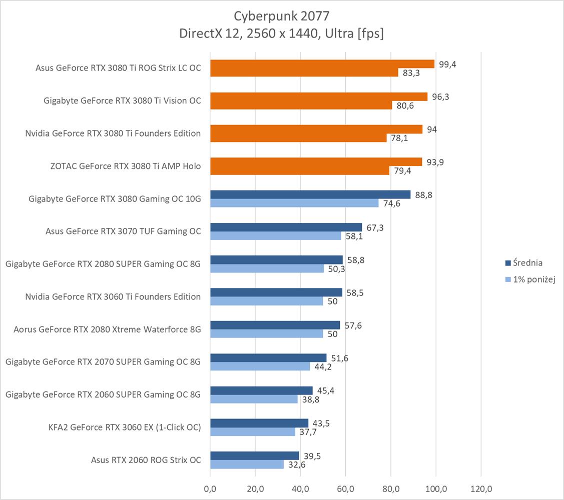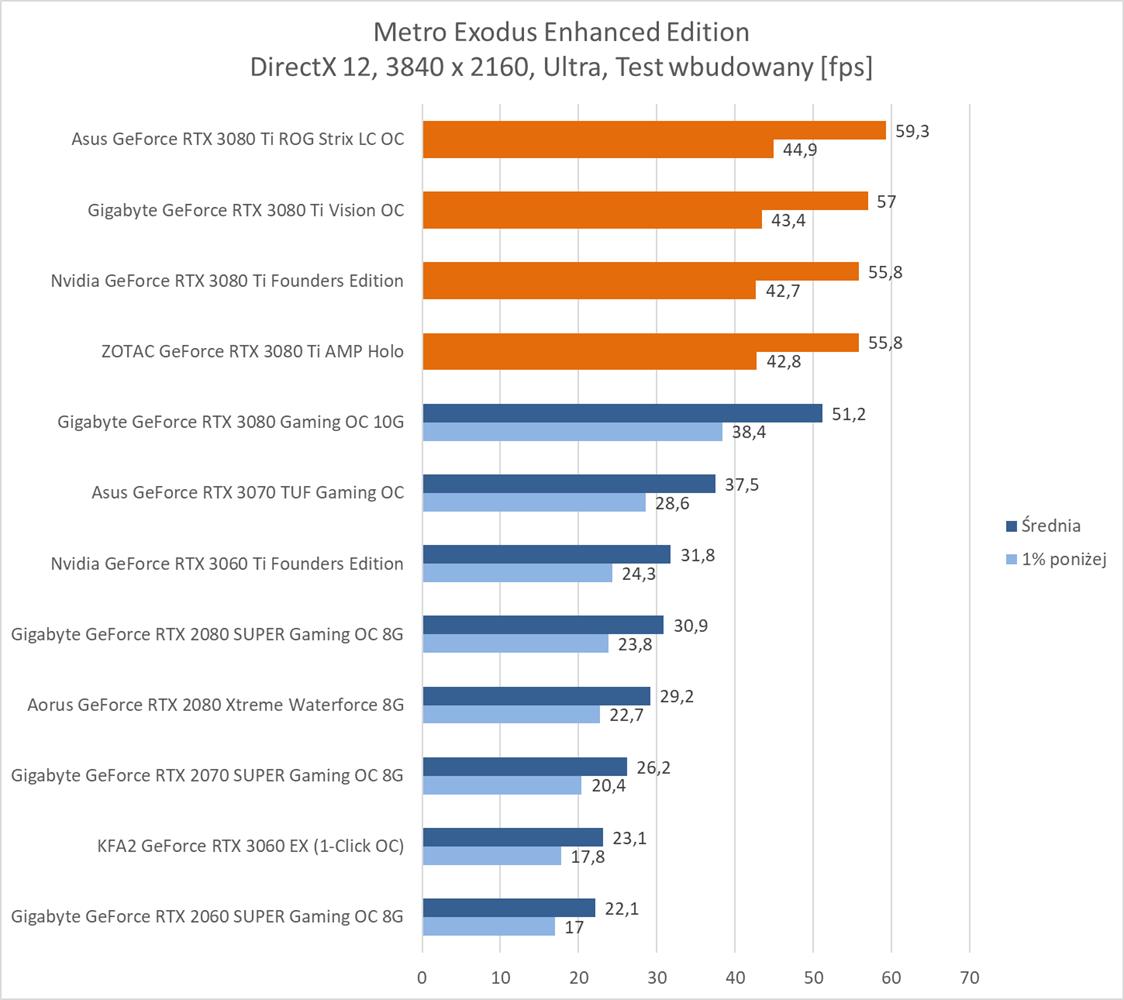 Średnia wydajność testowanych modeli GeForce RTX 3080 Ti