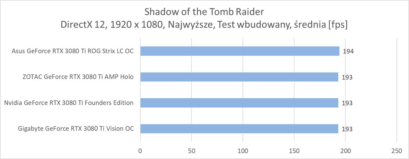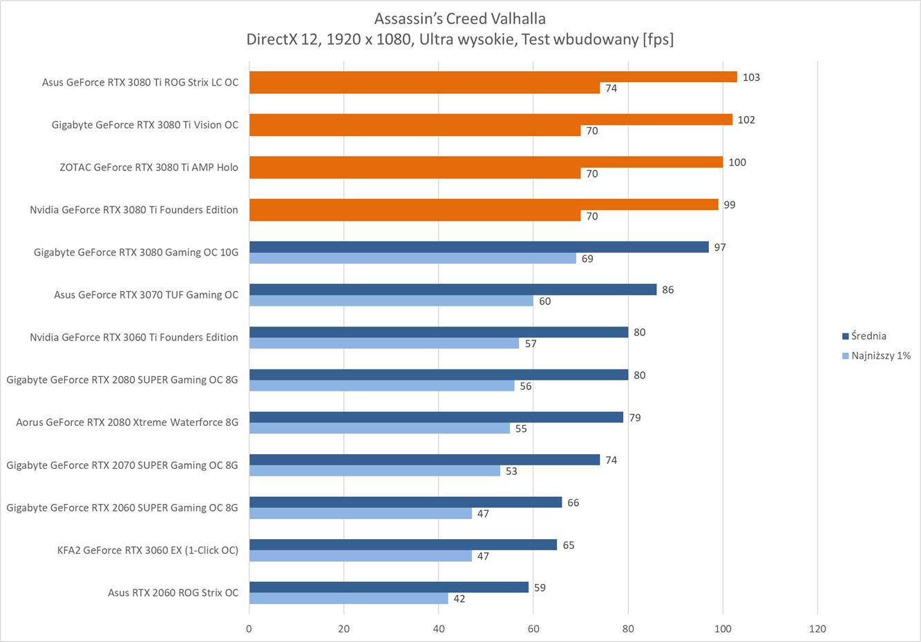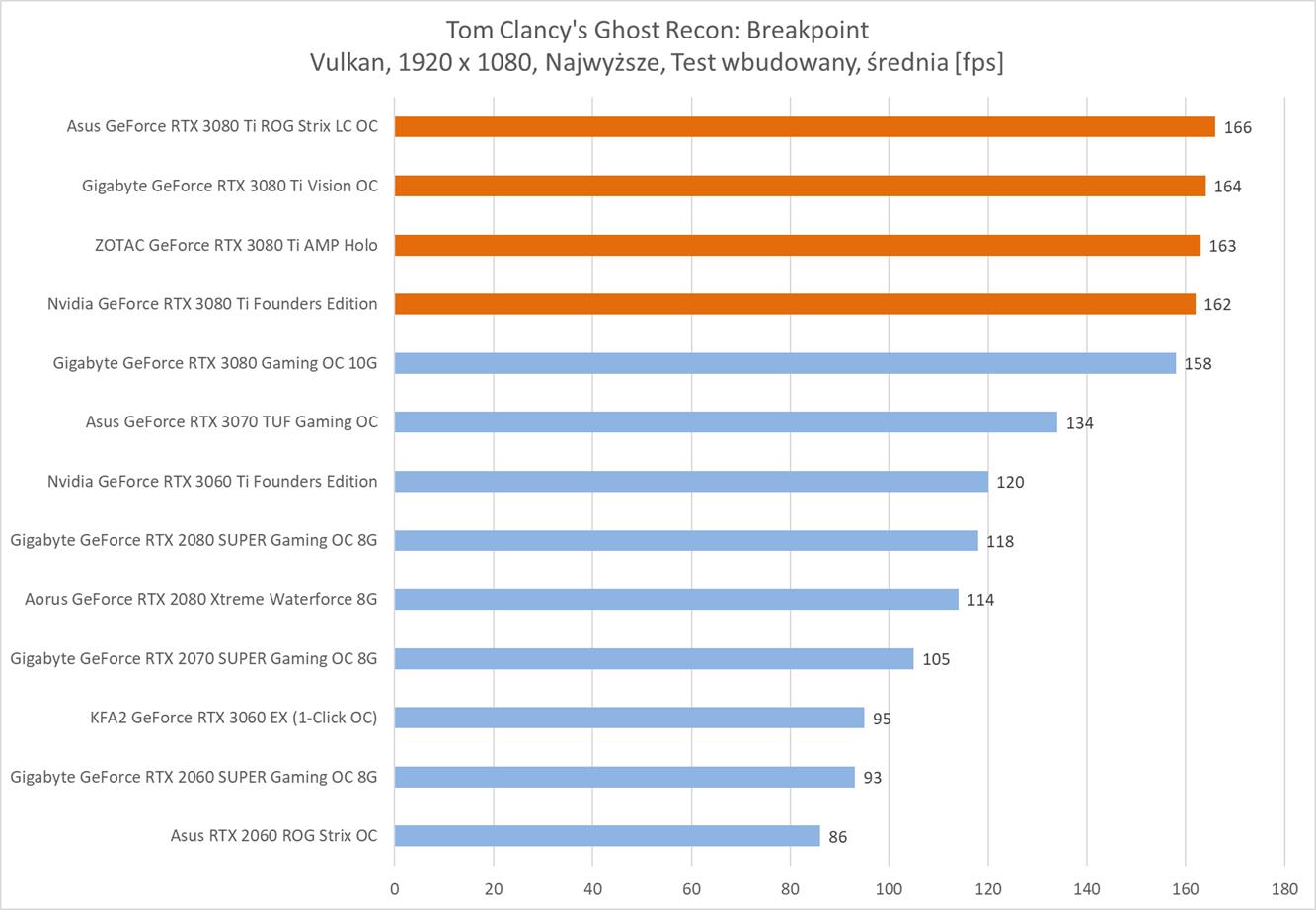 Rozdzielczość 1920 x 1080 jest zbyt mała, aby dobrze pokazać przewagę RTX 3080 Ti nad RTX 3080. Karty są na czele rankingu, a model Asusa wyróżnia się na tle konkurencji. Już ta rozdzielczość pokazuje, że ZOTAC ma rzeczywiście wydajność bliską Founders Edition, a Gigabyte jest troszkę lepszy. Oczywiście w tej rozdzielczości możecie liczyć na genialne wyniki we wszystkich tytułach.