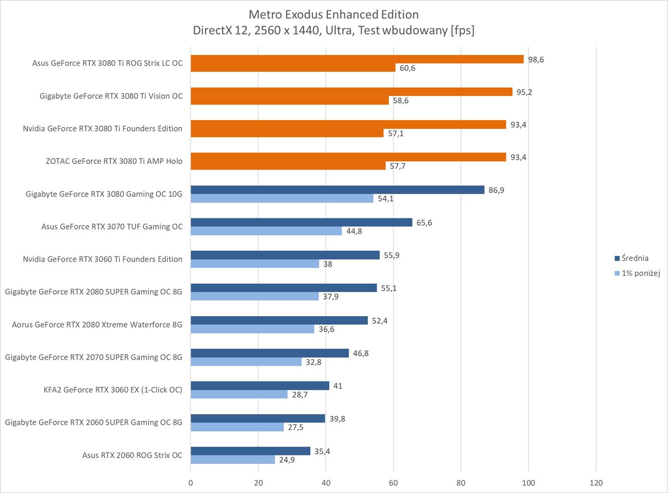 Nvidia GeForce RTX 3080 Ti Founders Edition nie ma fabrycznego oc i zegary boost wynoszą 1665 MHz. Natomiast karta zaskakuje w w benchmarku Metro Exodus 2560 x 1440 px. Średnie taktowanie wynosiło ok. 1786 MHz, czyli niewiele mniej niż w przypadku modelu ZOTACa.