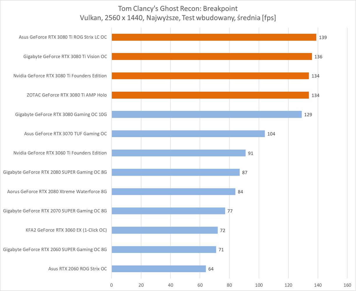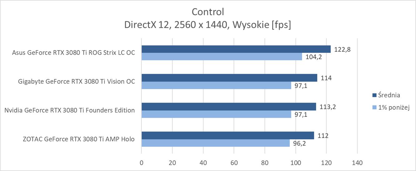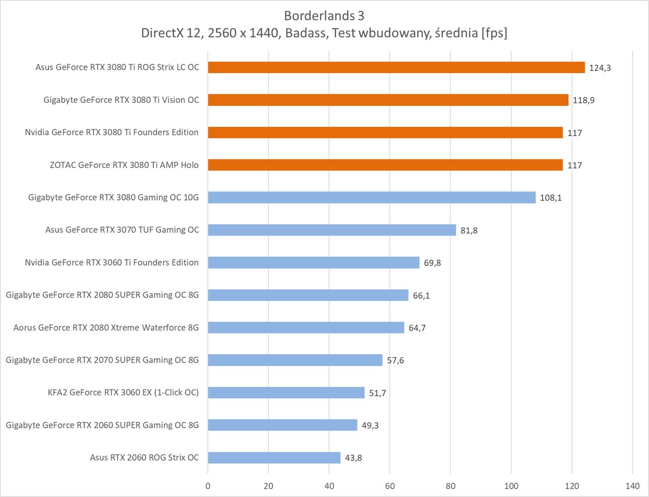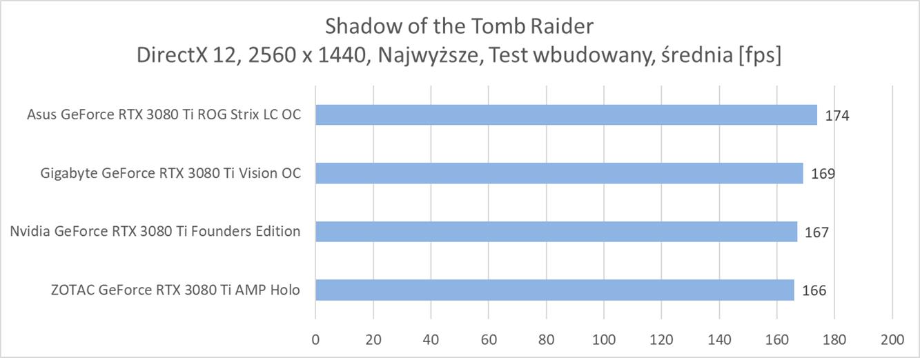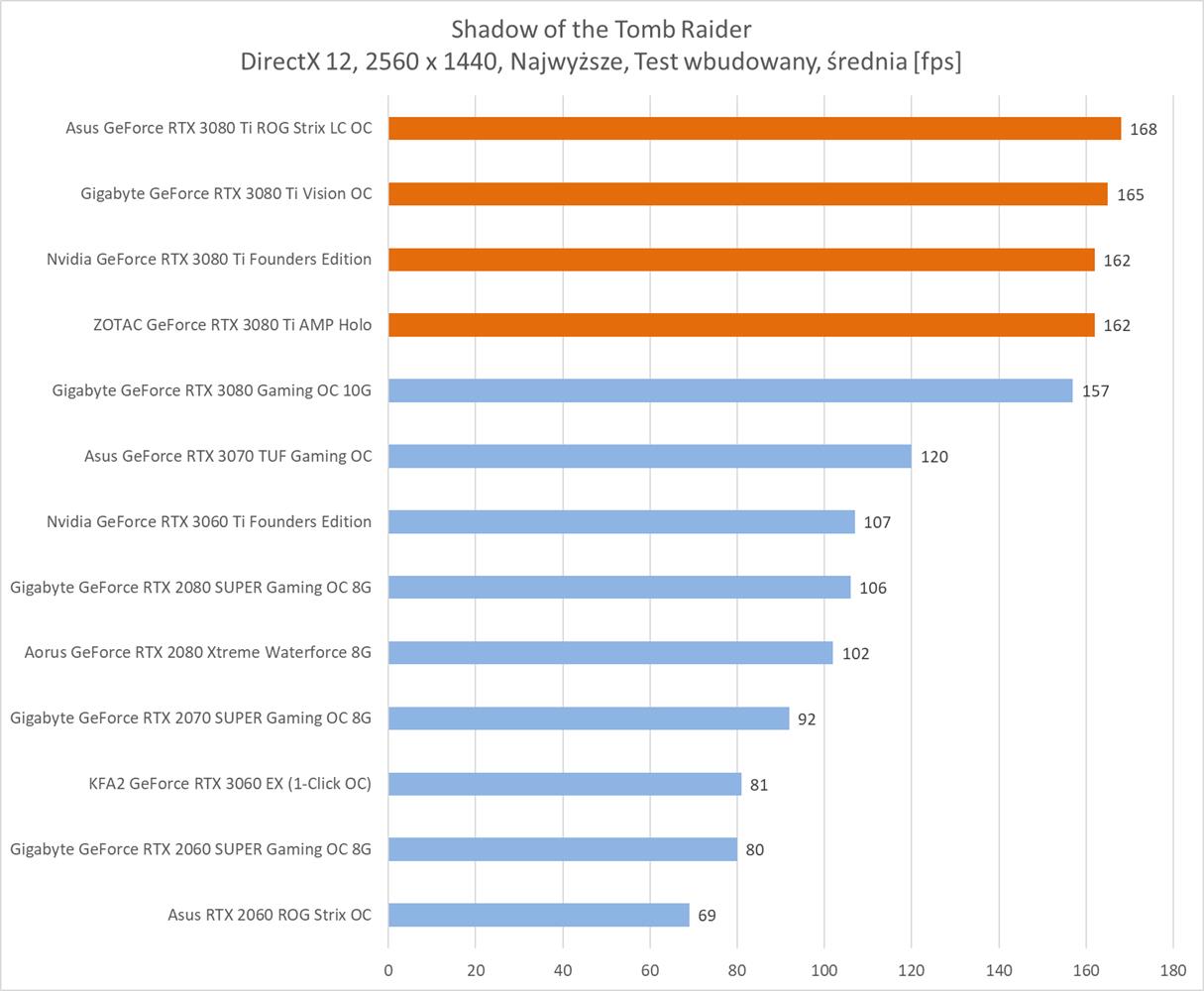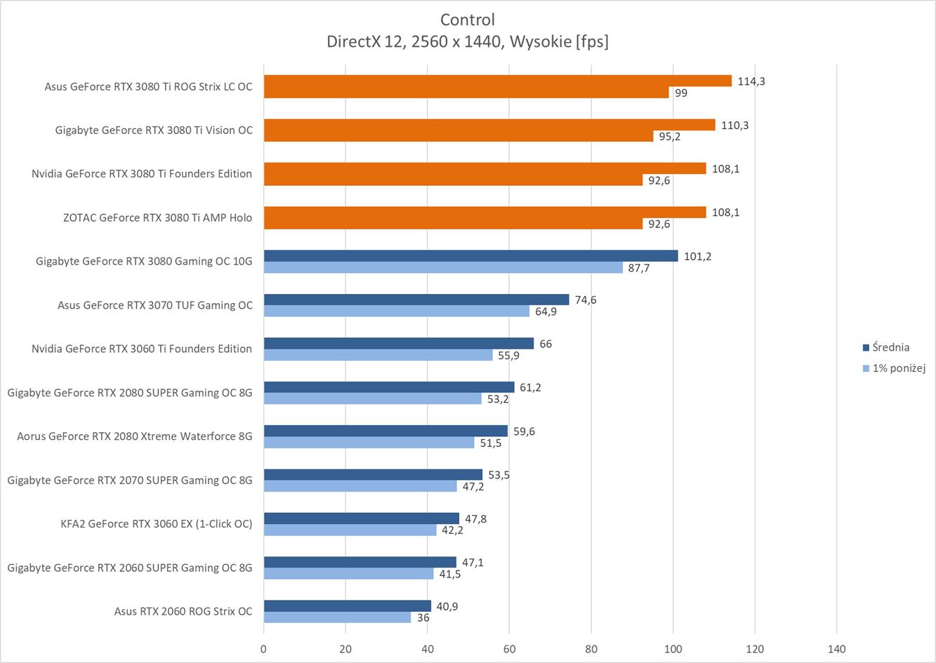 W 2560 x 1400 potwierdza się sytuacja z niższej rozdzielczości. Nadal wszystkie gry są w pełni płynne, a na czele jest Asus GeForce RTX 3080 Ti ROG Strix LC OC. Grafika ZOTACa jest praktycznie na równi z Nvidią, a nad nimi plasuje się Gigabyte GeForce RTX 3080 Ti Vision OC. Każda z kart oferuje jednak świetną wydajność.