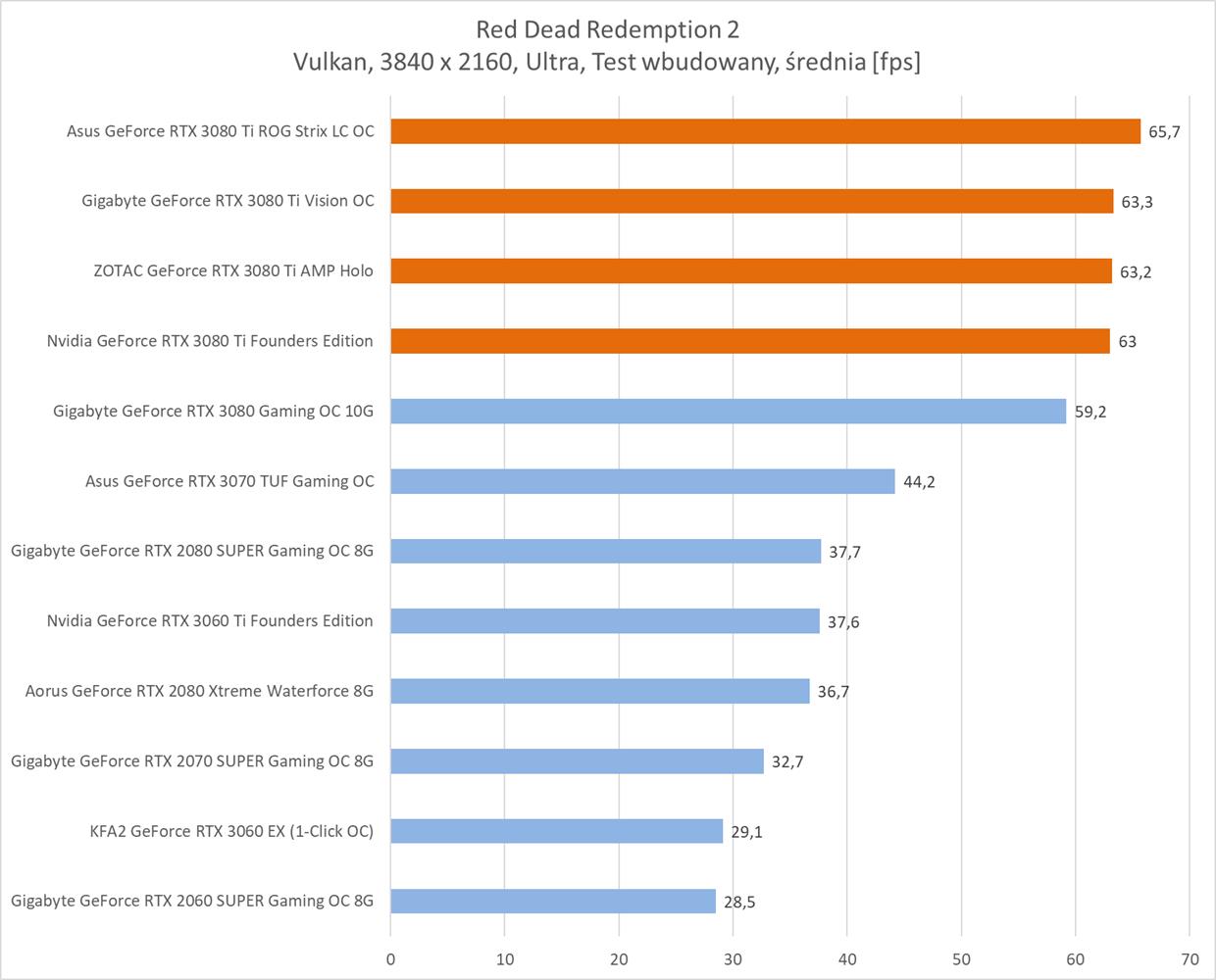 Najbardziej wymagająca rozdzielczość pokazuje już znacznie większą przewagę nad podkręconym RTX 3080. To właśnie do niej stworzone zostały karty RTX 3080 Ti i najfajniej wypadają. Pod względem plasowania się testowanych modeli ponownie nie ma zaskoczenia i kolejność jest taka sama jak wyżej. Warto też zauważyć, że po zmianie gier w platformie testowej w rozdzielczości 3840 x 2160 na najwyższych detalach pojawiają się tytuły, gdzie nawet RTX 3080 Ti nie osiąga średnio 60 fps, co dobrze też pokazuje, jak wysokie wymagania mają najnowsze gry.