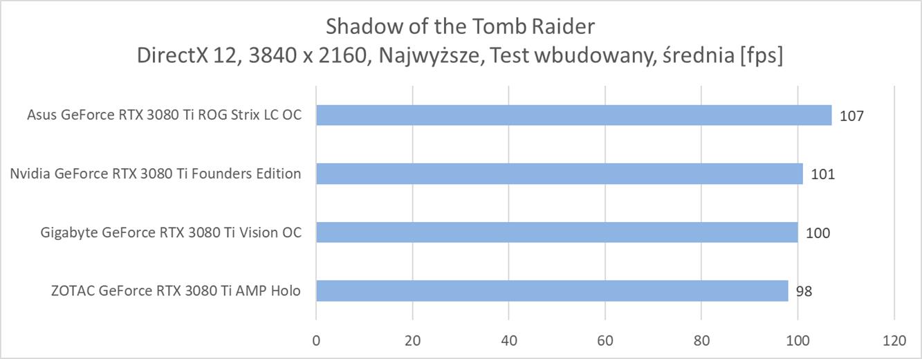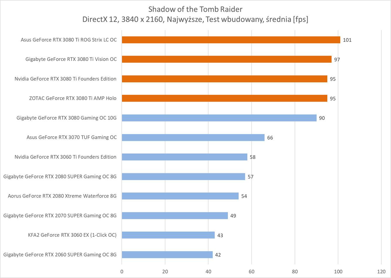 Spośród testowanych GeForce RTX 3080 Ti bez wątpienia najlepiej wypada Asus GeForce RTX 3080 Ti ROG Strix LC OC. Karta jest znacznie wydajniejsza od konkurencji i było to spodziewane – w końcu na najwyższe fabryczne OC. Na drugim miejscu jest Gigabyte GeForce RTX 3080 Ti Vision OC, który wpada trochę lepiej od dwóch pozostałych modeli. W testach zawodzi trochę ZOTAC GeForce RTX 3080 Ti AMP Holo, który notuje wyniki praktycznie na poziomie Founders Edition, gdzie karta jest przecież fabrycznie podkręcona. Niestety ma ona problem z mocnym zbijaniem taktowania, co widać też po OC. Tam grafika notuje najniższe wyniki spośród testowanych i praktycznie nie ma różnic po OC w temperaturach, głośności czy poborze mocy. Wynika to właśnie z faktu, że taktowania są zbijane do praktycznie bazowych w FurMark nawet po OC. Tutaj niestety coś firmie nie wyszło, więc generalnie mimo fabrycznego OC nie ma co liczyć na większe wyniki niż w przypadku Founders Edition.