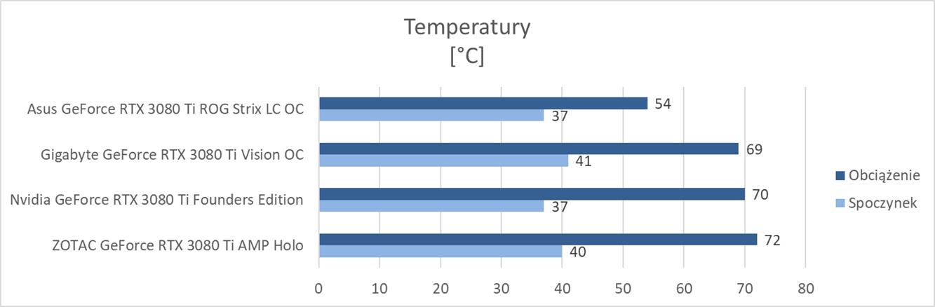 Pod tym względem najlepiej wypada Asus GeForce RTX 3080 Ti ROG Strix LC OC i to na obu BIOS – jest on niedościgniony. Na drugim końcu jest model Nvidia GeForce RTX 3080 Ti Founders Edition z dosyć wysokimi wynikami. Karta ZOTAC jest trochę zimniejsza, a Gigabyte notuje już bardziej przystępne wyniki.
