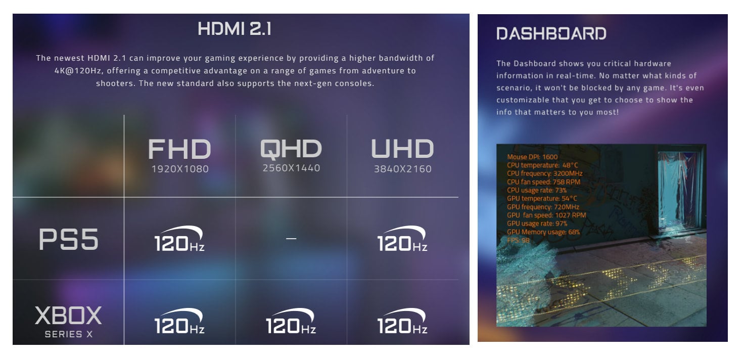 Chociaż rozmiar zdaje się sugerować coś innego, to AORUS FO48U OLED 120Hz jest monitorem do grania, a nie telewizorem (wbrew obecności pilota), co akcentuje niski czas opóźnienia GtG (1 ms), nakładka OSD, pokazująca informacje o sprzęcie w czasie rzeczywistym. Gigabyte chwali się też na materiałach promocyjnych tym, jakie tryby wyświetlania są obsługiwane przez konsole nowej generacji za pośrednictwem HDMi 2.1.