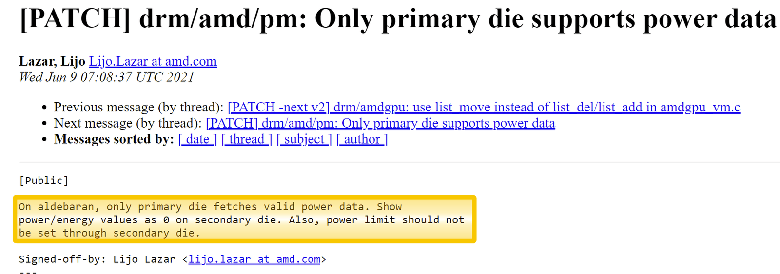 Wcześniej docierały do nas pogłoski, że karty Instinct MI200 na bazie architektury CDNA2 o nazwie kodowej Aldebaran będą posiadały przynajmniej dwa rdzenie graficzne – die0 oraz die1. Te dziś zostały potwierdzone i nawet okraszone szczegółami, wedle których jeden z tych krzemowych rdzeni będzie zajmować się kwestiami dotyczącymi mocy, które “nie powinny być ustawiane przez drugorzędny”.