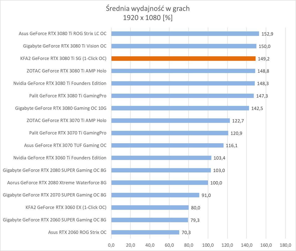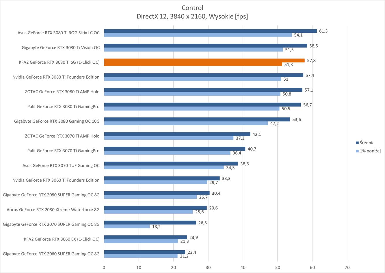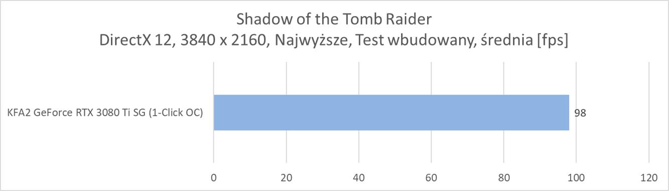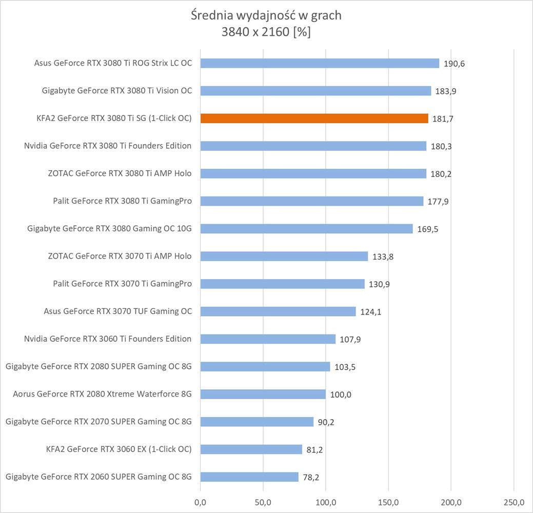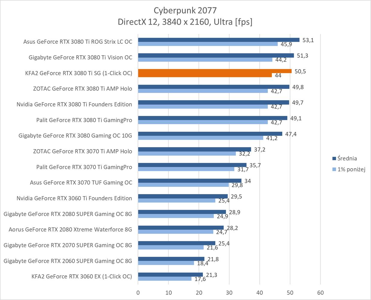 KFA2 GeForce RTX 3080 Ti SG (1-Click OC) została stworzona do rozdzielczości 4K. Uzyskane wyniki jednak nie zaskakują – grafika plasuje się pomiędzy modelem Gigabyte a ZOTAC/ Founders Edition. Widać więc mały zysk z fabrycznego OC.