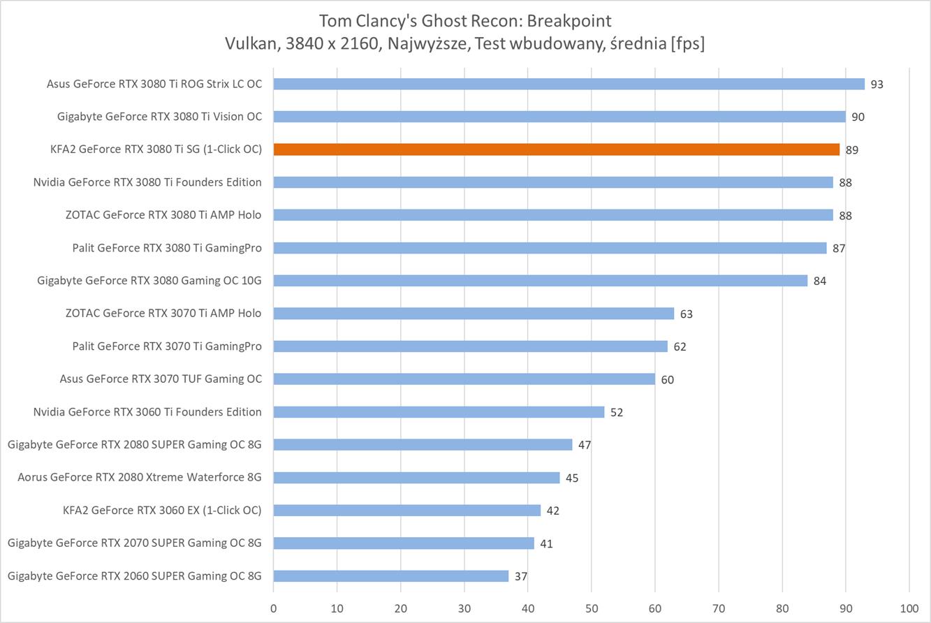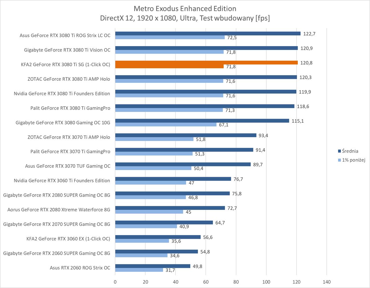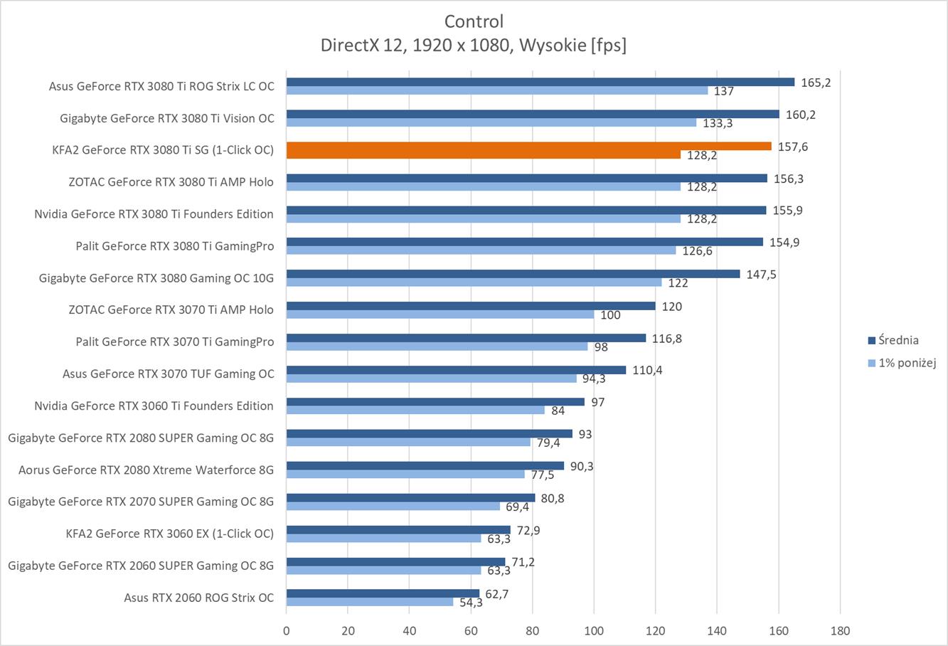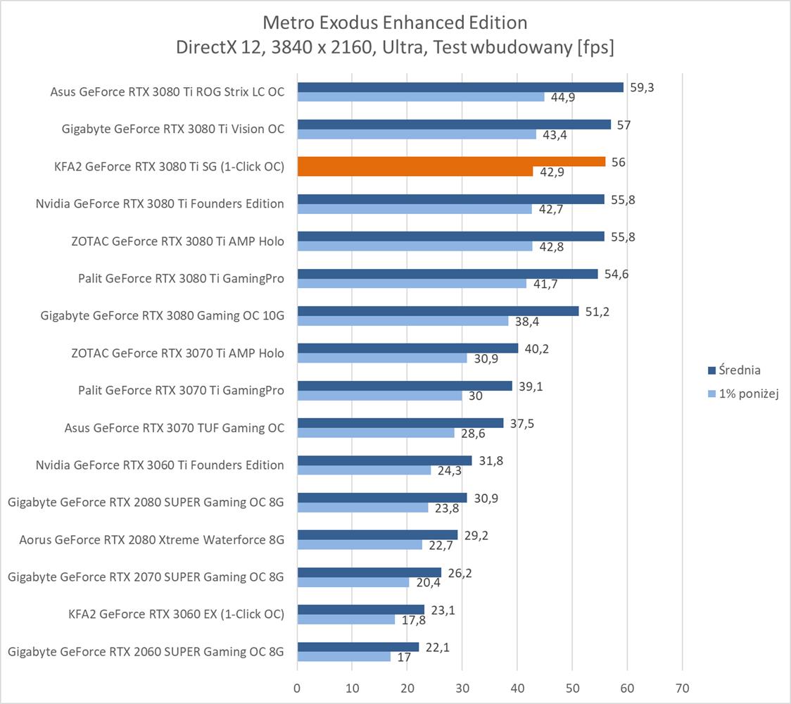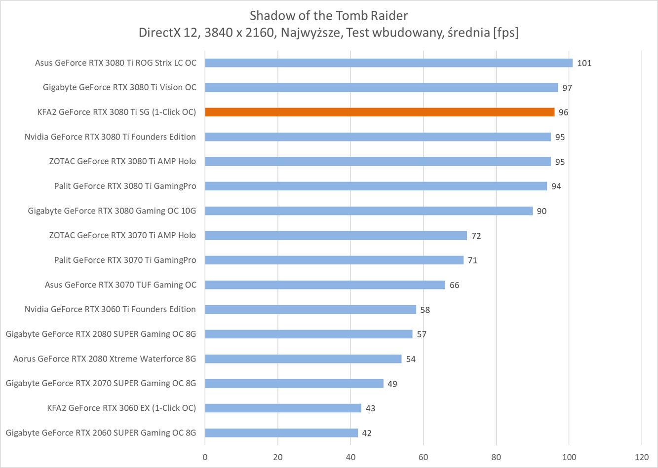 KFA2 GeForce RTX 3080 Ti SG (1-Click OC) została stworzona do rozdzielczości 4K. Uzyskane wyniki jednak nie zaskakują – grafika plasuje się pomiędzy modelem Gigabyte a ZOTAC/ Founders Edition. Widać więc mały zysk z fabrycznego OC.