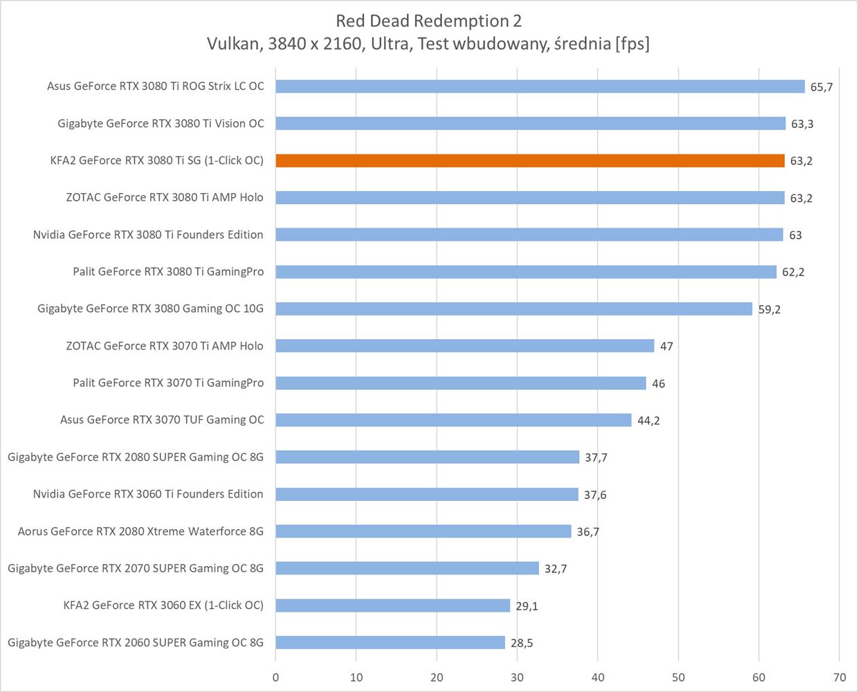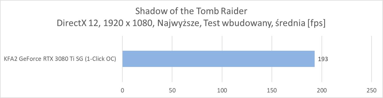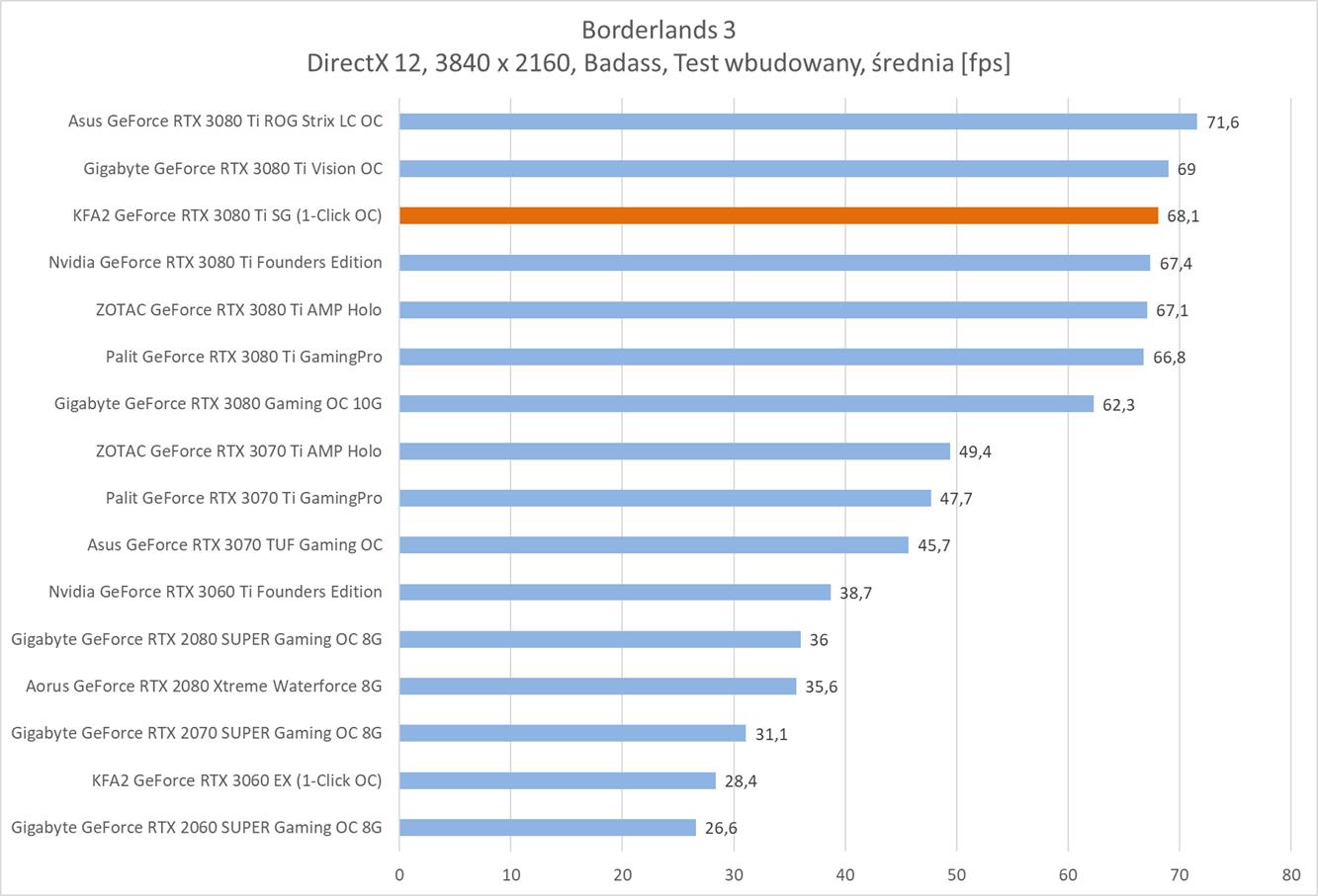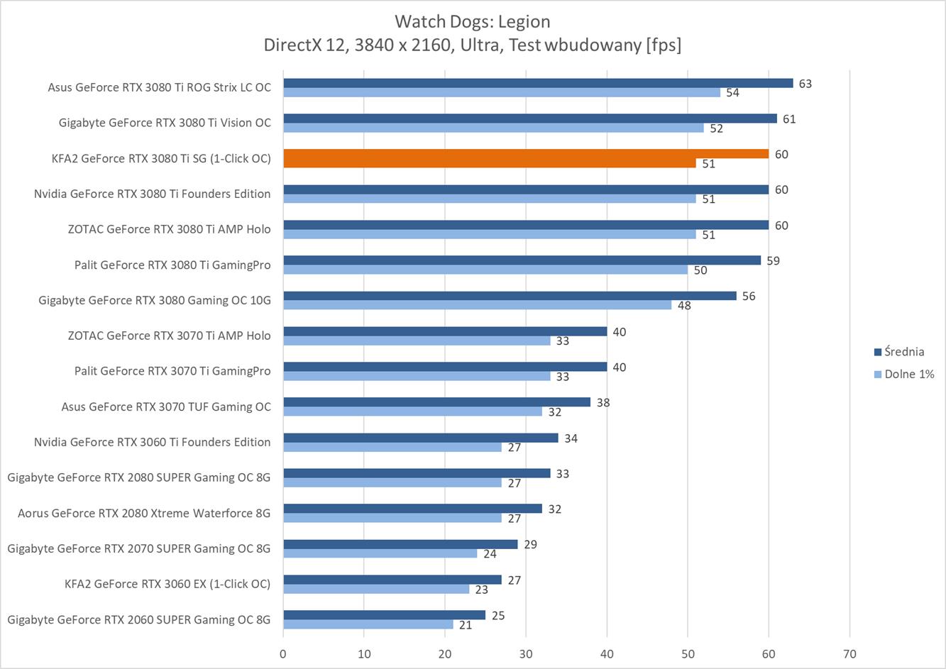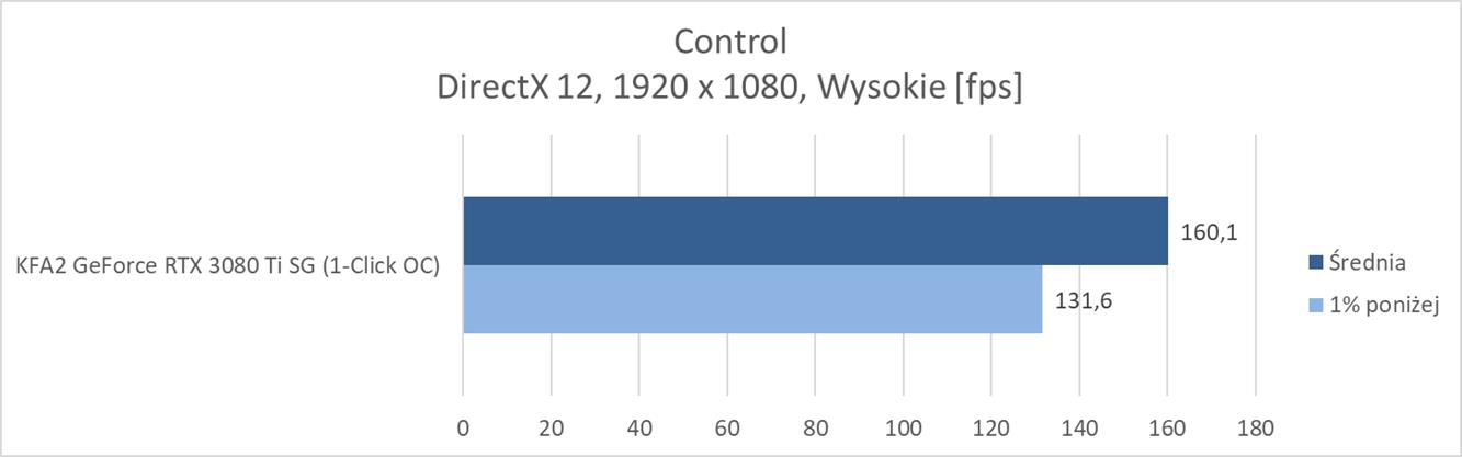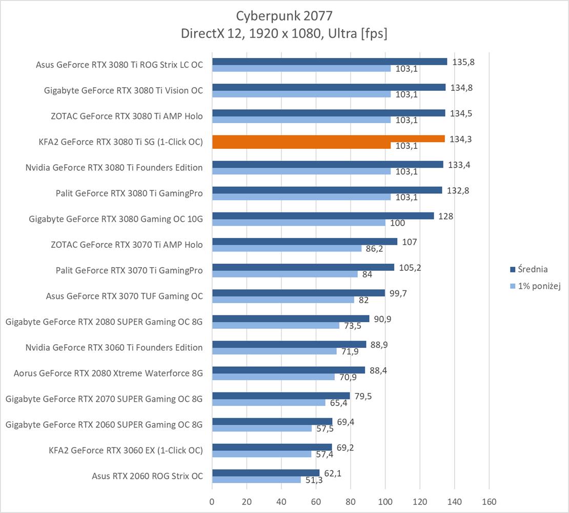 KFA2 GeForce RTX 3080 Ti SG (1-Click OC) została stworzona do rozdzielczości 4K. Uzyskane wyniki jednak nie zaskakują – grafika plasuje się pomiędzy modelem Gigabyte a ZOTAC/ Founders Edition. Widać więc mały zysk z fabrycznego OC.