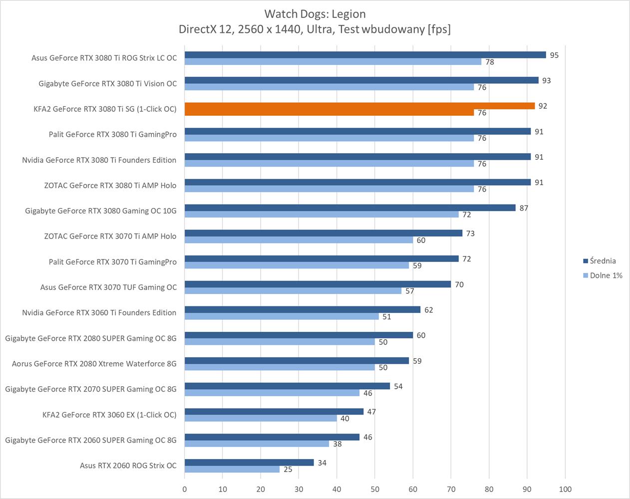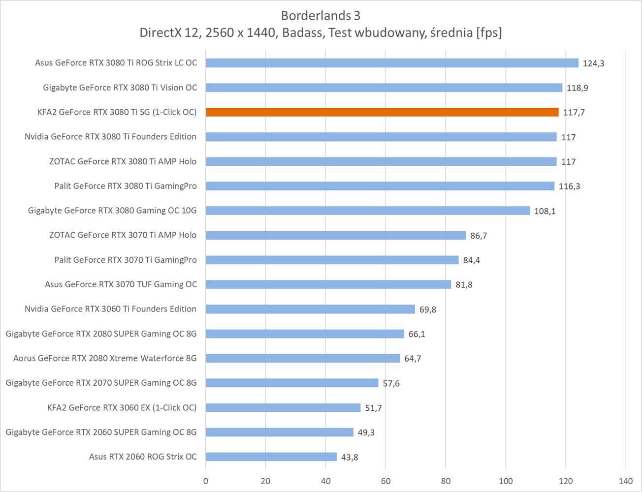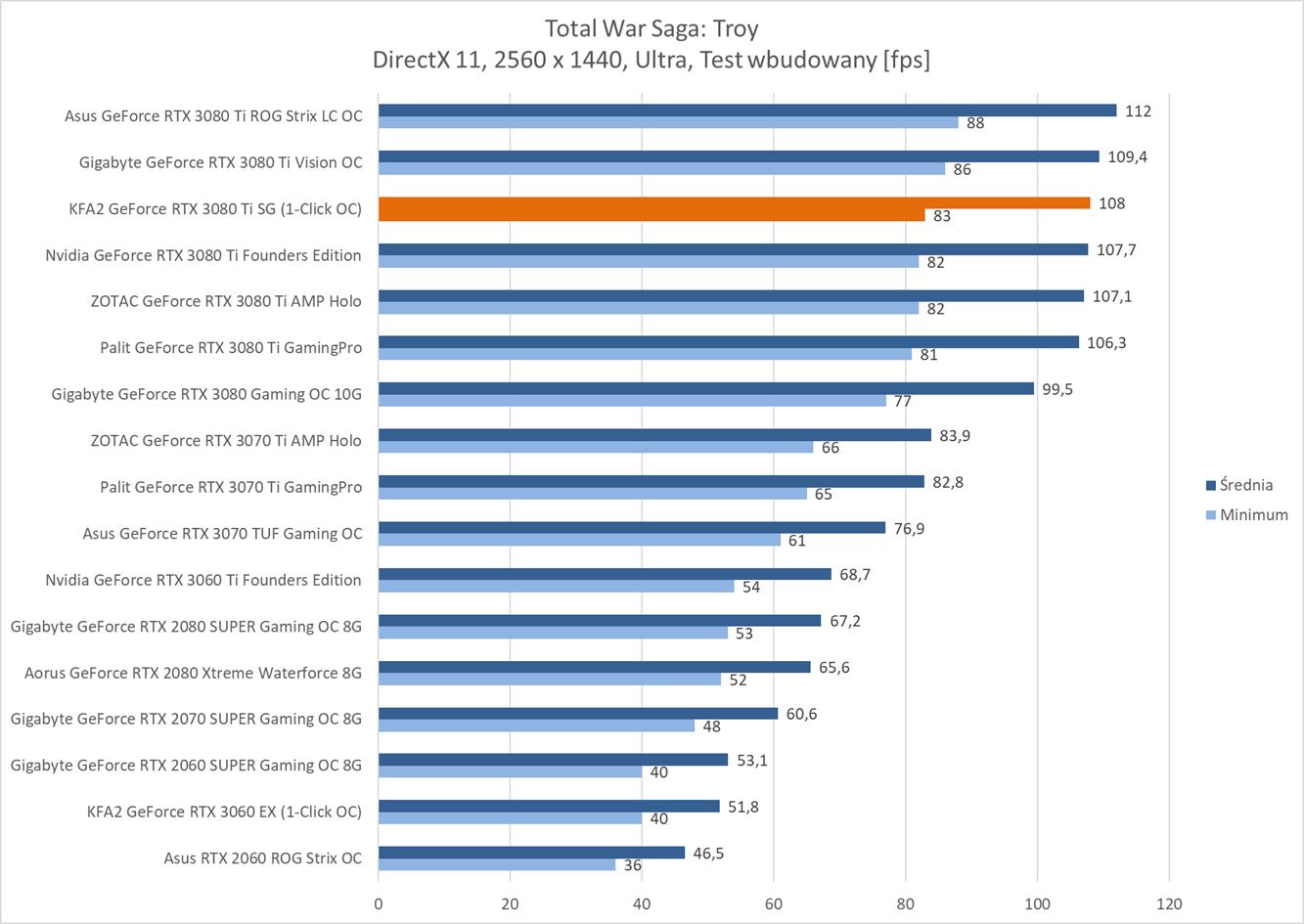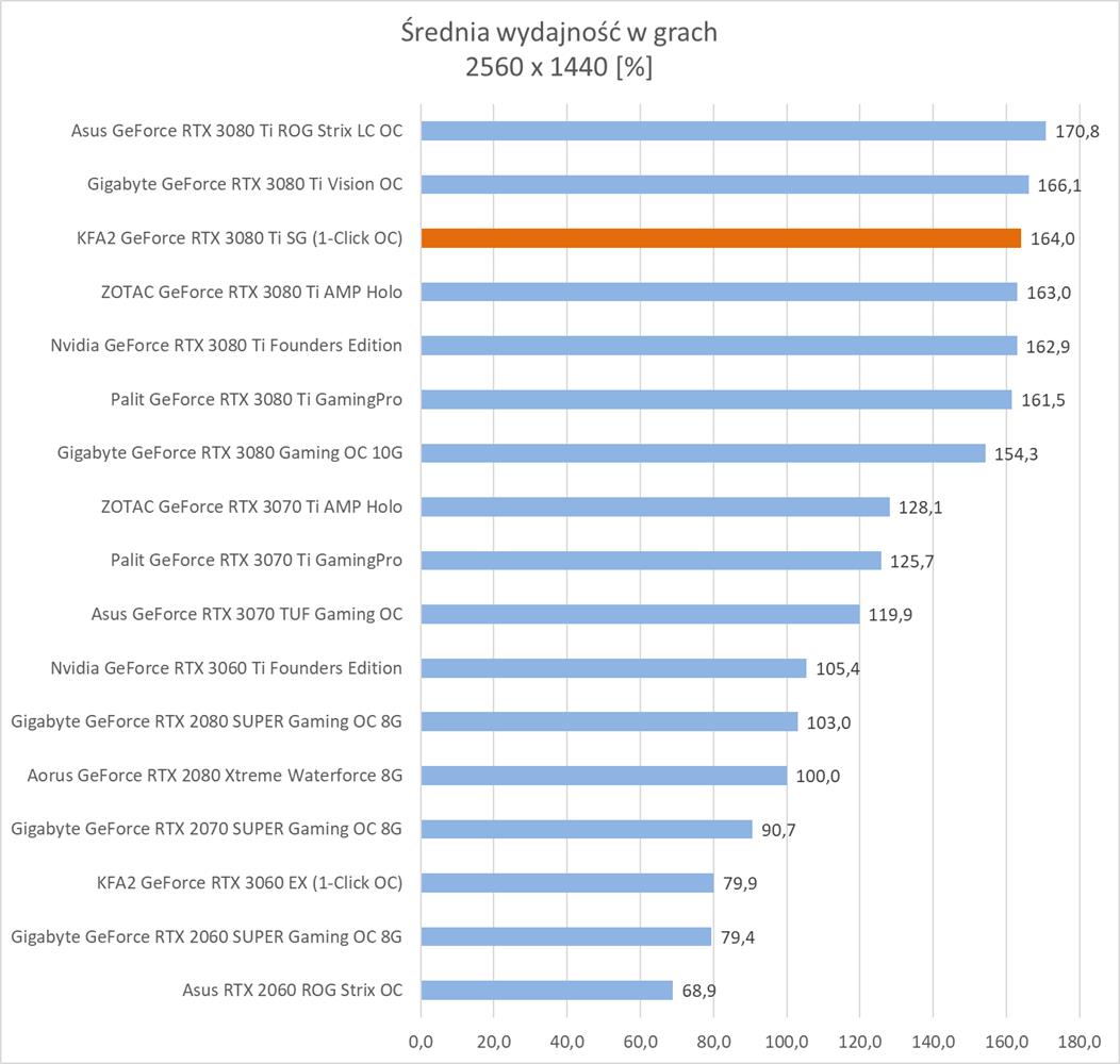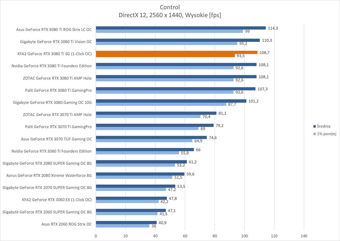 Rozdzielczość 2560 x 1440 to ponownie znakomite wyniki KFA2 GeForce RTX 3080 Ti SG (1-Click OC). Znajduje się ona w czołówce kart na wykresach, więc jest naprawdę świetnie.