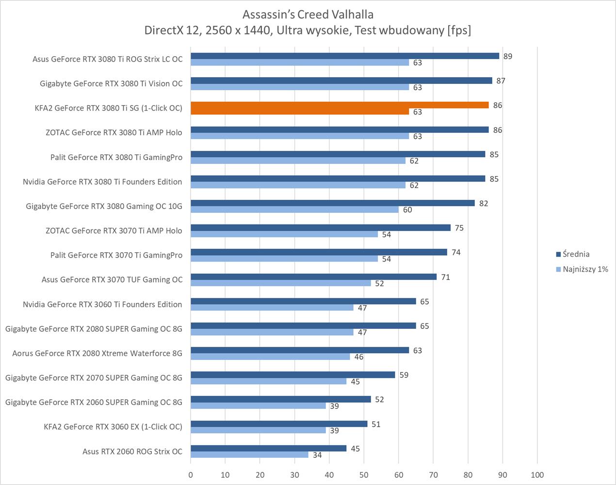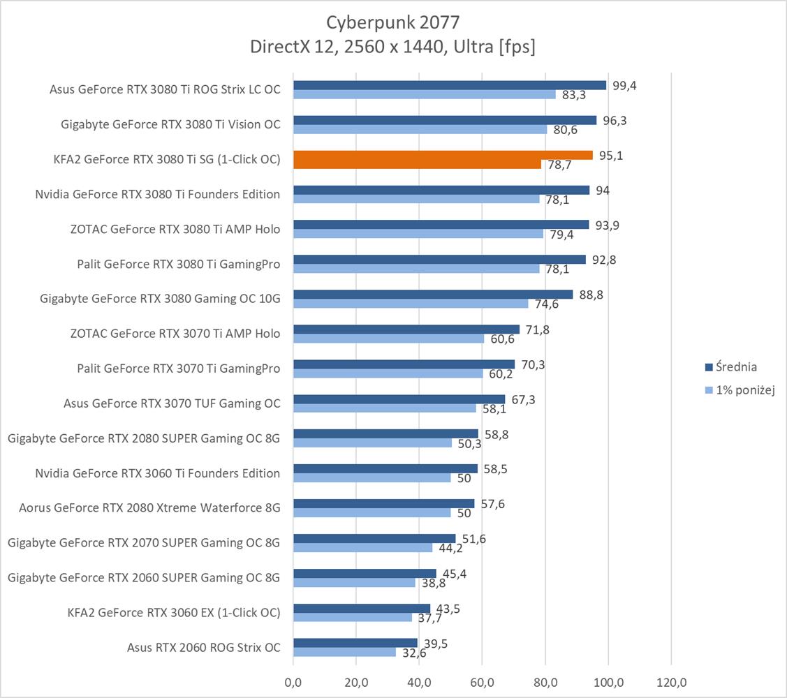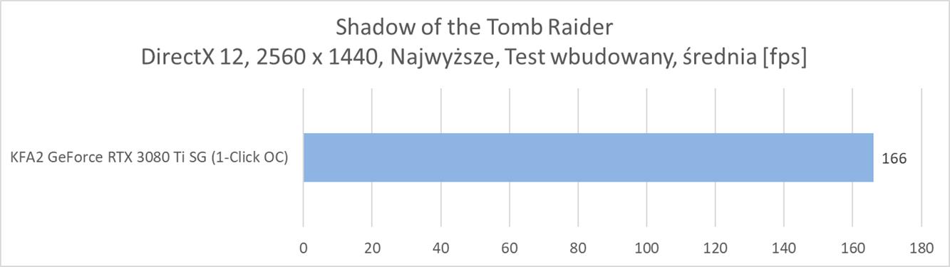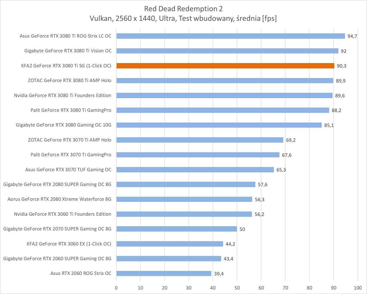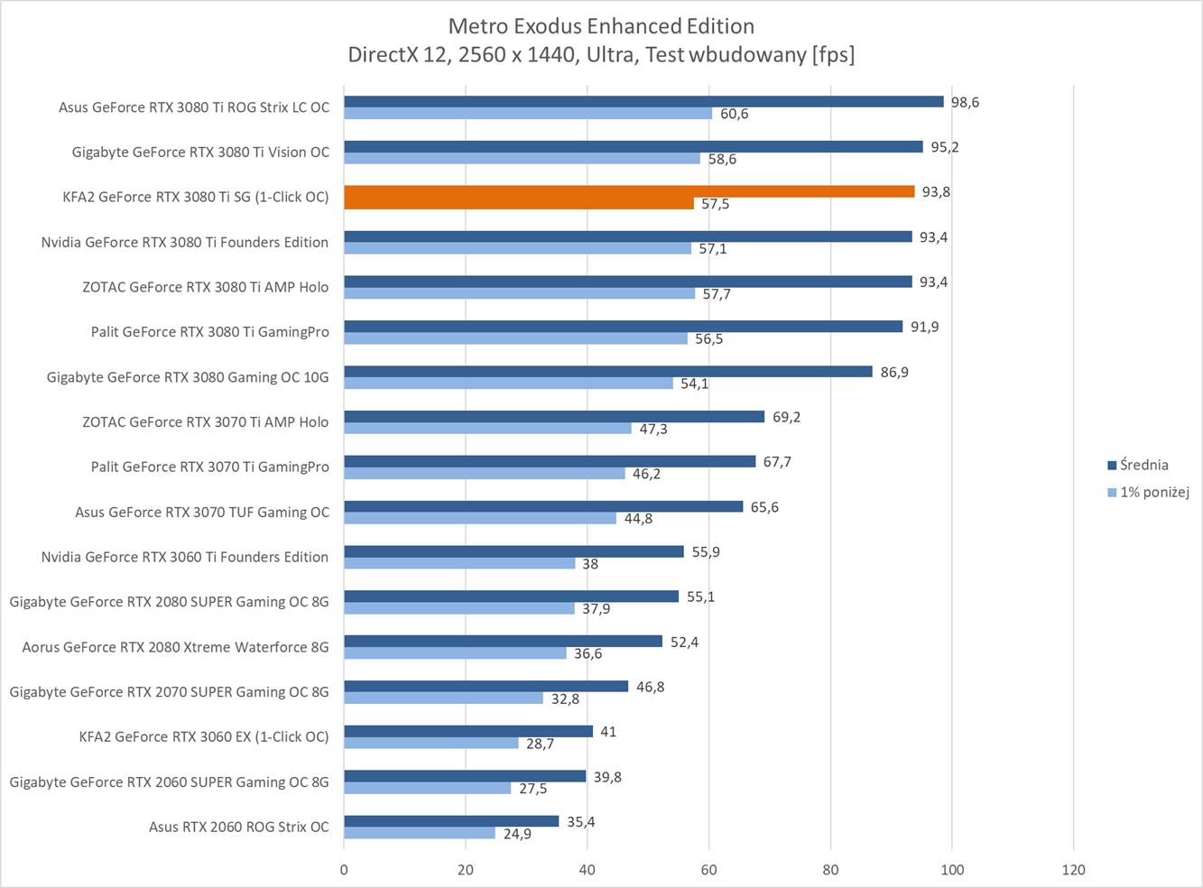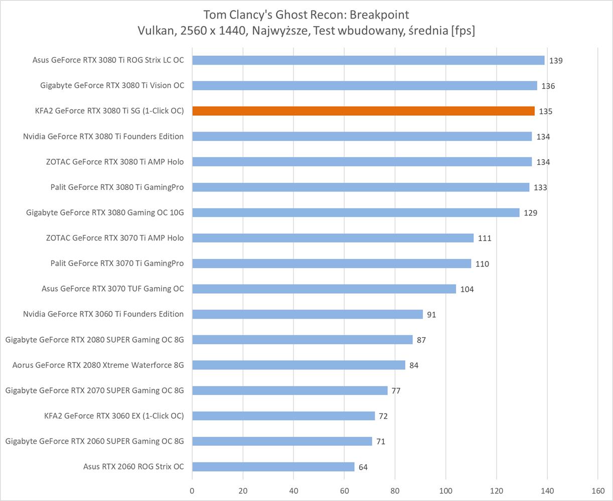 Rozdzielczość 2560 x 1440 to ponownie znakomite wyniki KFA2 GeForce RTX 3080 Ti SG (1-Click OC). Znajduje się ona w czołówce kart na wykresach, więc jest naprawdę świetnie.