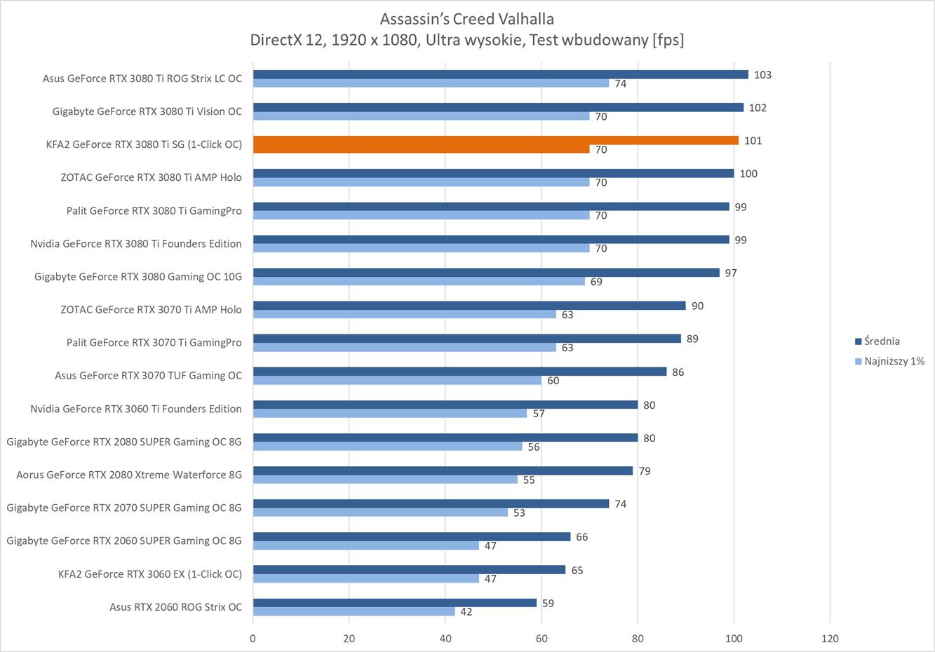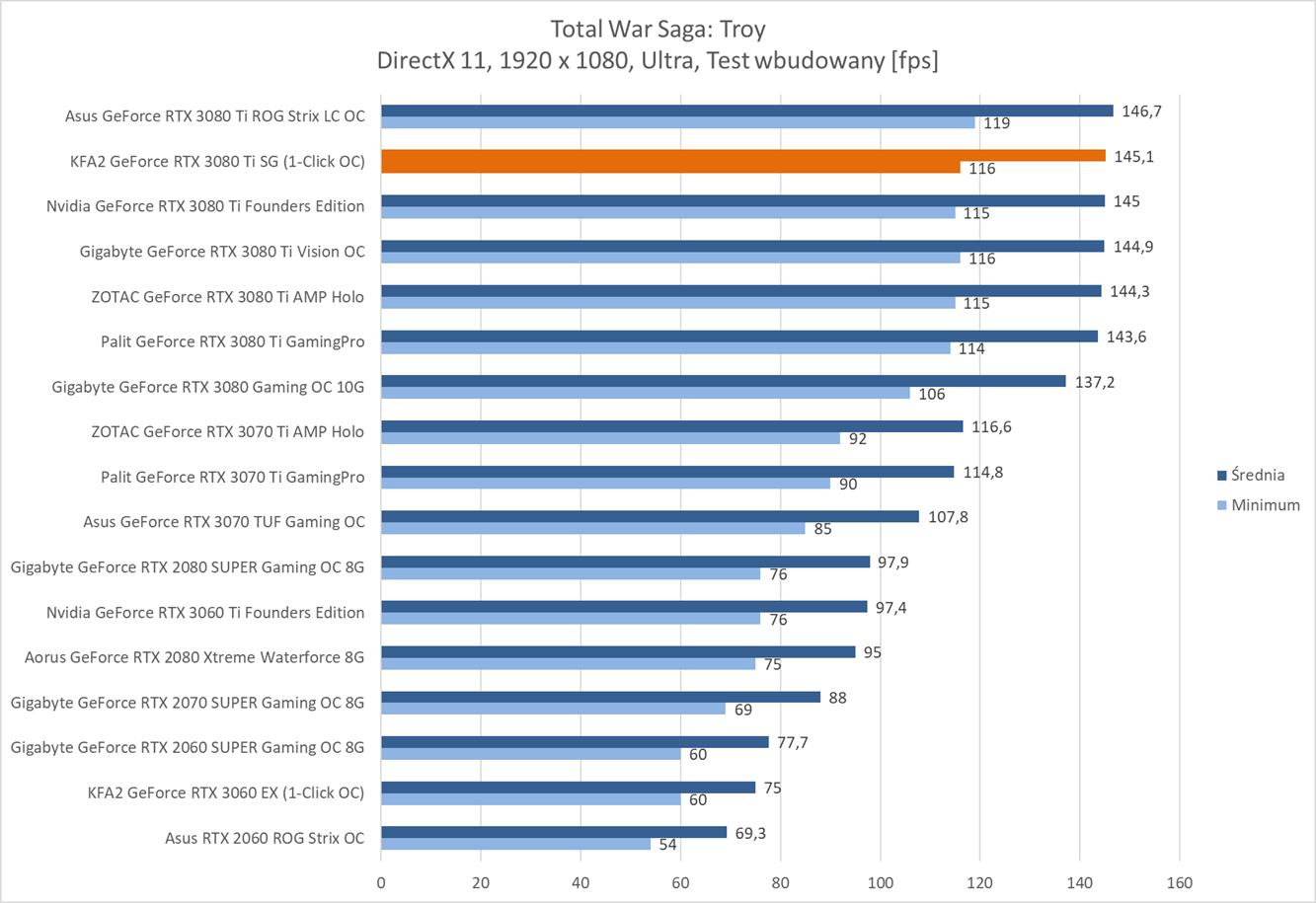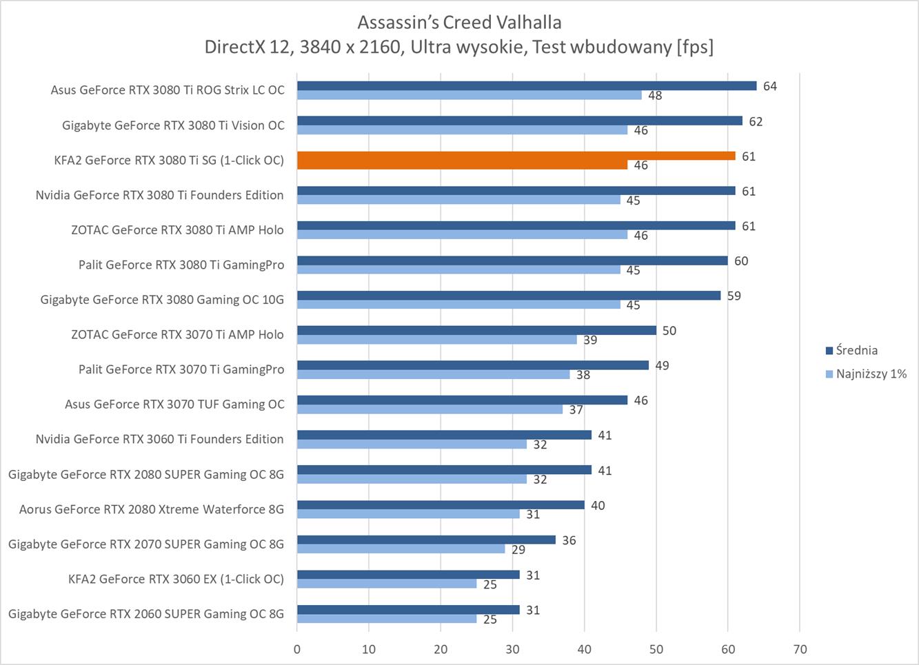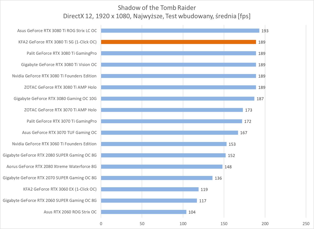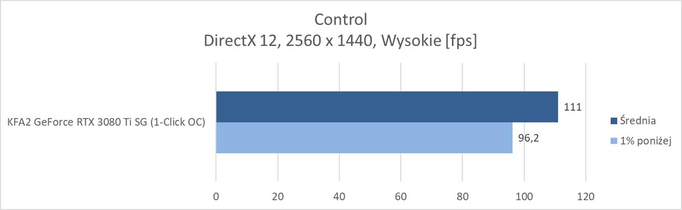 Rozdzielczość 2560 x 1440 to ponownie znakomite wyniki KFA2 GeForce RTX 3080 Ti SG (1-Click OC). Znajduje się ona w czołówce kart na wykresach, więc jest naprawdę świetnie.