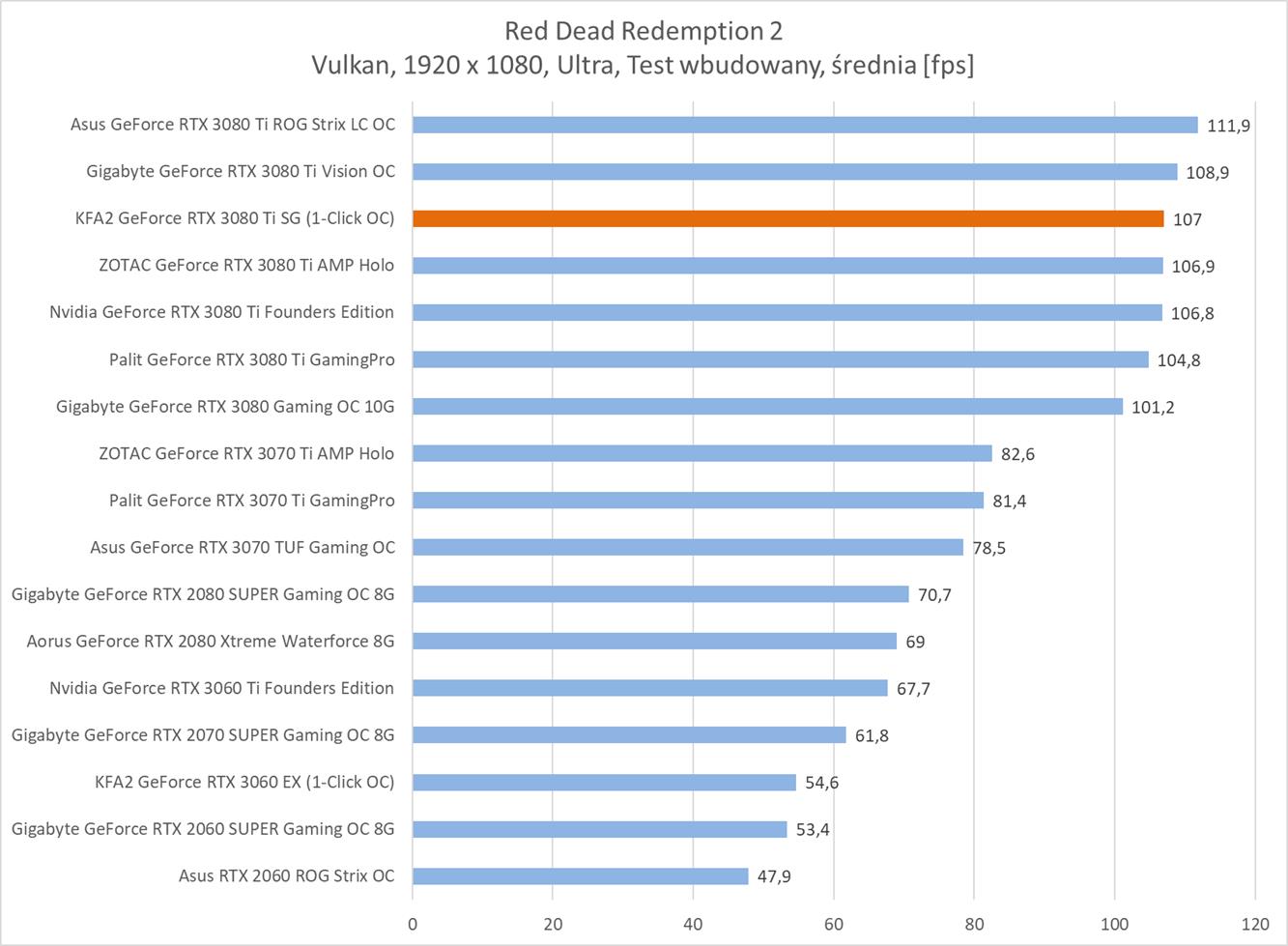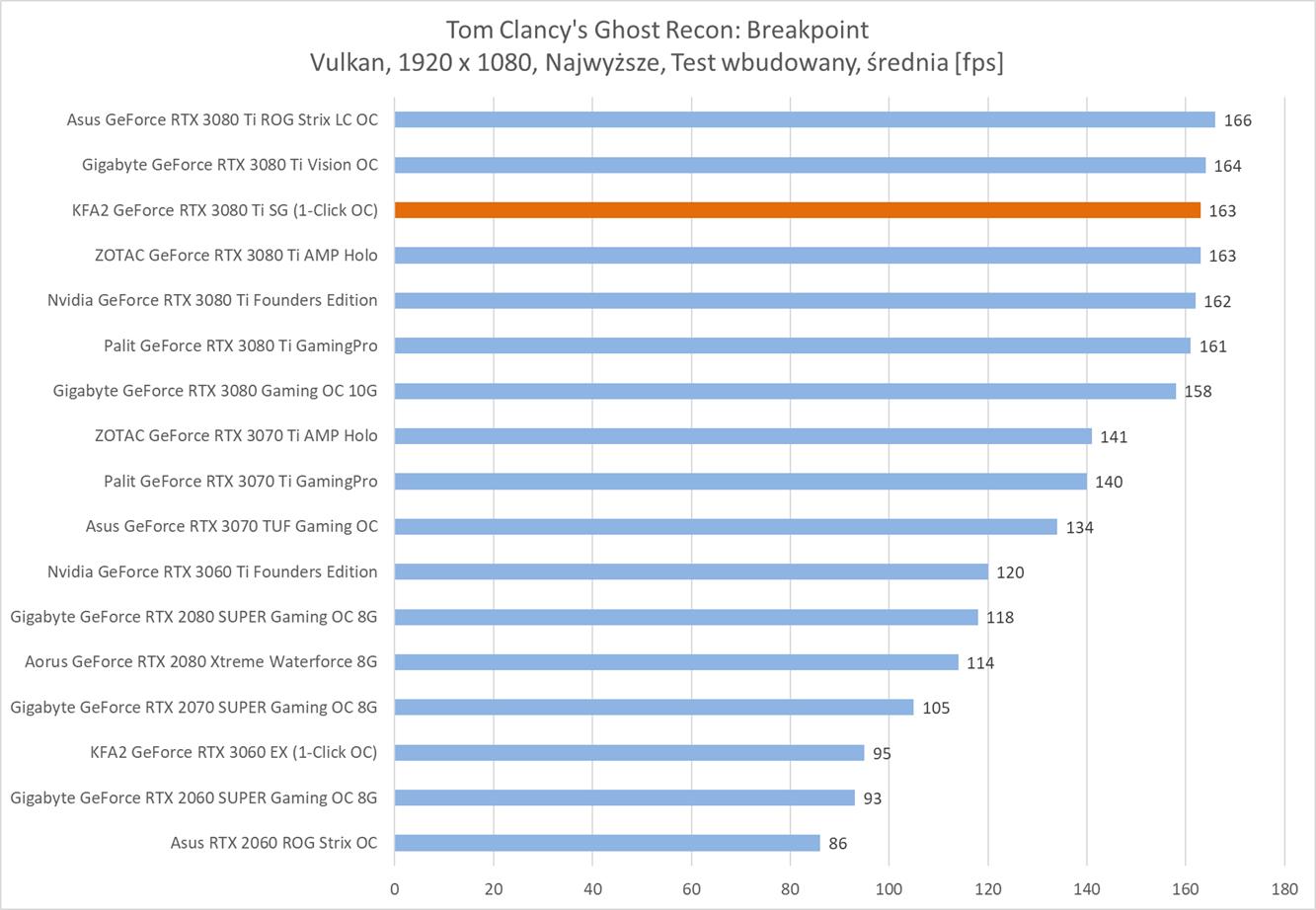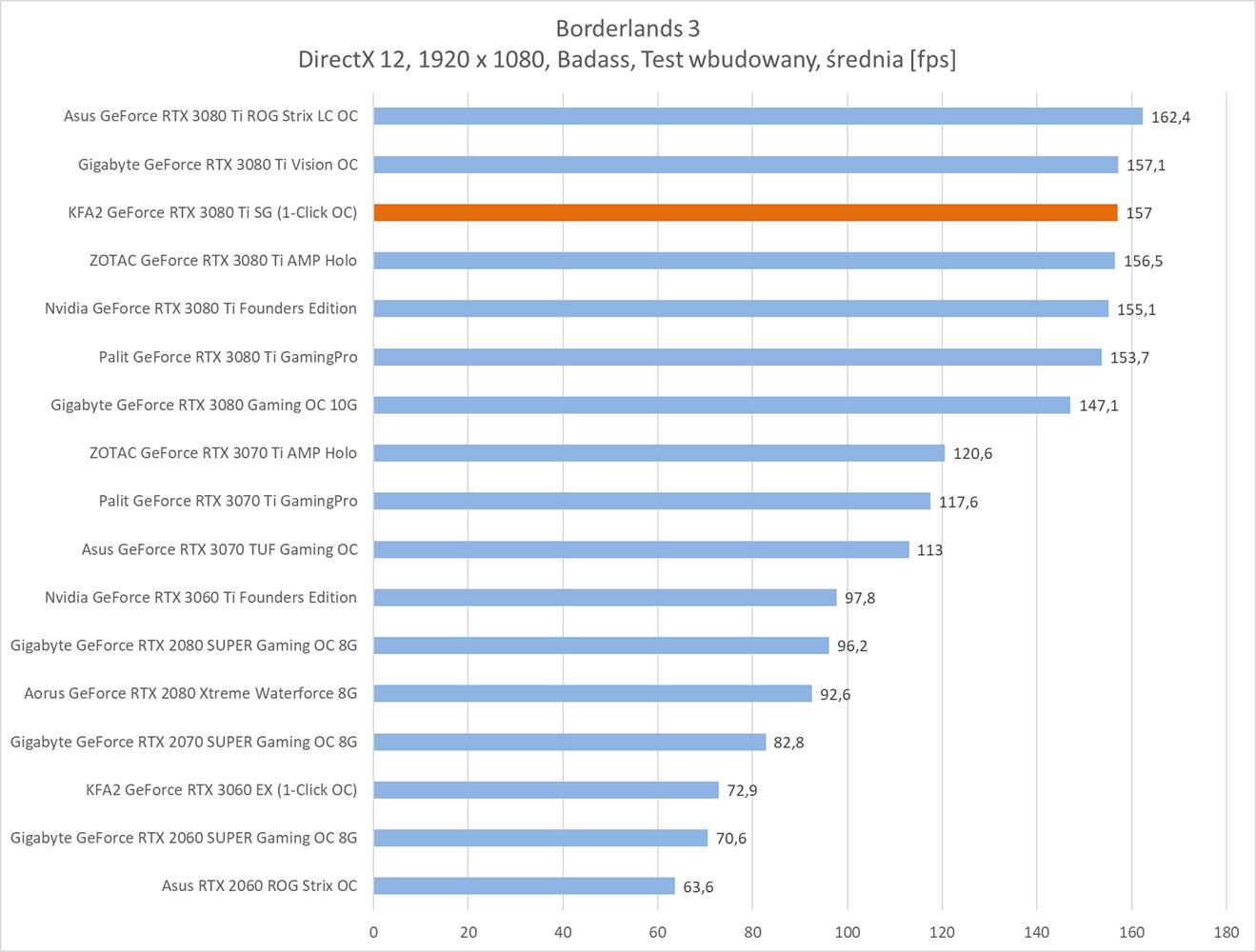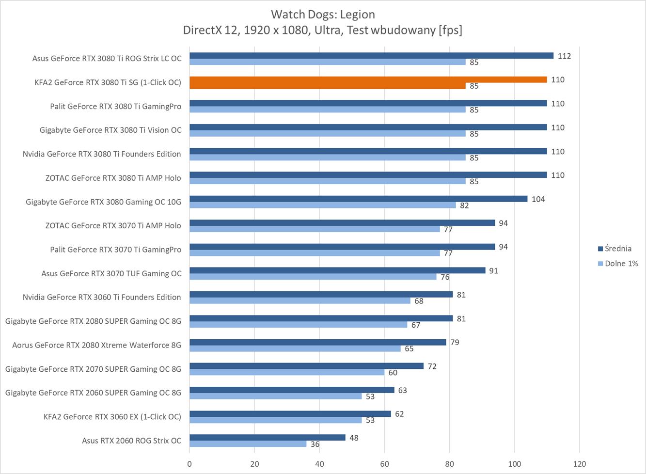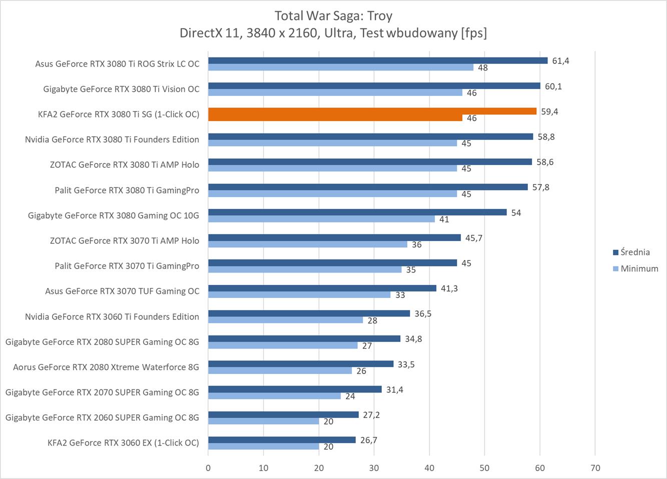 Rozdzielczość 2560 x 1440 to ponownie znakomite wyniki KFA2 GeForce RTX 3080 Ti SG (1-Click OC). Znajduje się ona w czołówce kart na wykresach, więc jest naprawdę świetnie.