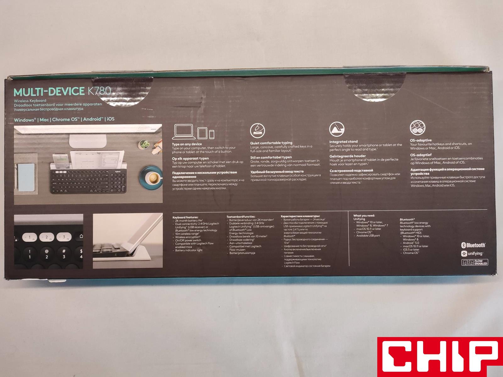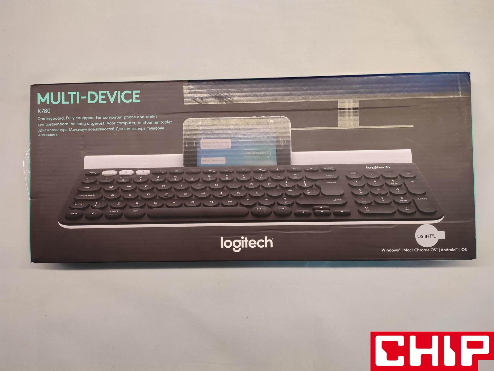 Klawiaturę Logitech K780 otrzymujemy w prostopadłościennym pudełku z wielkim renderem produktu na przodzie, który pokazuje nie tylko niego, ale też to, w jaki sposób możemy z niej korzystać. Wszystko sprowadza się do wyposażenia klawiatury w specjalną gumową podpórkę.