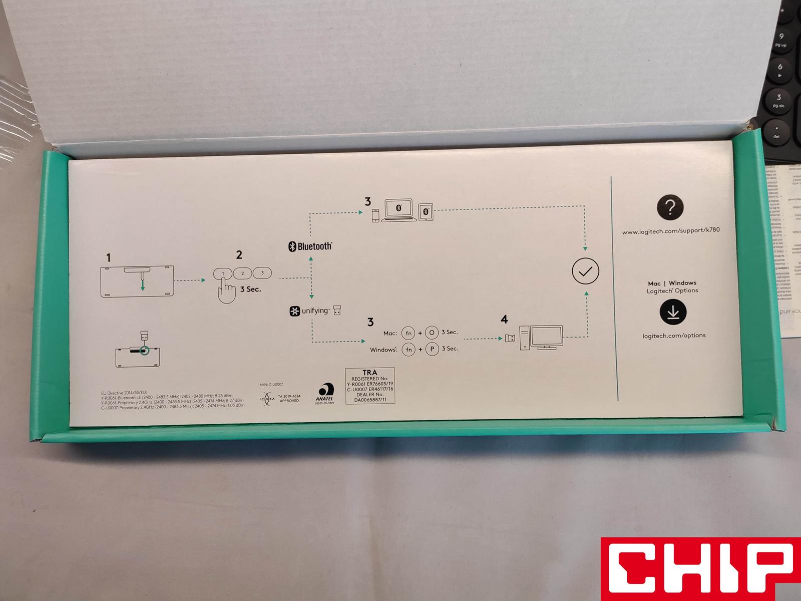 Pudełko jest zdominowane morskim odcieniem, ale najważniejsze jest przecież to, co się w nim znajduje. Tak więc wewnątrz znajdziemy oczywiście naszą klawiaturę Logitech K780 zabezpieczoną w folię, odbiornik radiowy USB-A, osadzone już na swoim miejscu dwie baterie AA oraz instrukcję obsługi z kartą informacyjną.