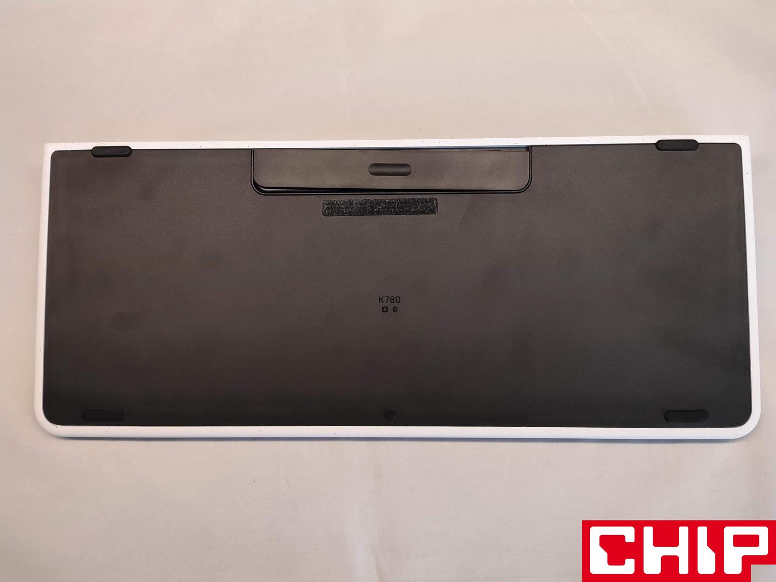 Wracając jeszcze do konstrukcji Logitech K780 to jej druga ciemnoszara część obudowy jest przeznaczona samej klawiaturze. Z jednej strony oferuje wypukłe klawisze funkcyjne, a z drugiej delikatnie wklęsłe okrągłe z przyklejoną do nich czcionką w formie naklejek. To oszczędność, ale dosyć oczywista, bo łącząca się z brakiem podświetlenia klawiszy. Na spodzie Logitech K780 znajdziemy z kolei przesuwaną zaślepkę oraz cztery antypoślizgowe gumowe podkładki.