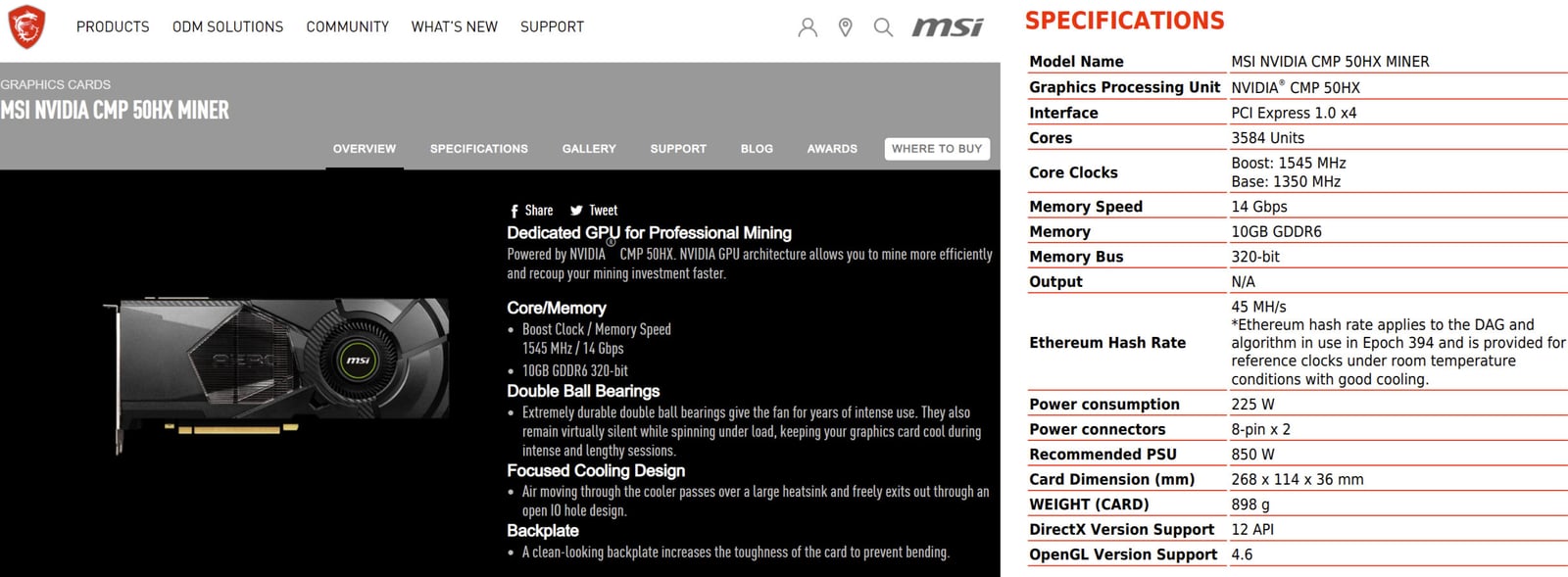 W wydaniu od MSI karta graficzna CMP 50HX MINER bazuje najpewniej na konsumenckim modelu RTX 2080 Ti, czy RTX 2080 AERO pod kątem laminatu, bazując na chłodzeniu turbinowym z kart starszej generacji. Co ciekawe, choć NVIDIA zapowiadała podobną wydajność kopania Ethereum w przypadku 50HX w porównaniu do RTX 2080 Ti, to obie karty mają inną specyfikację. To oczywiście wszystkich zaskoczyło.