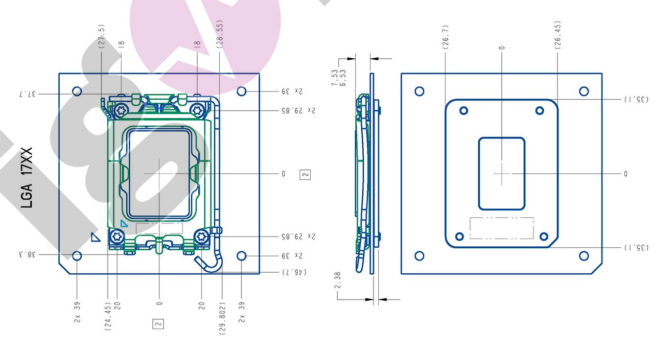 Teraz z kolei możemy podejrzeć pierwsze zdjęcie osłony gniazda LGA17XX/1800, które to zostało udostępnione przez wspomnianego @momomo_us. Te wskazuje, że do obu typów gniazd można zastosować tę samą osłonę, co sugeruje, że prawie na pewno mają ten sam rozmiar.