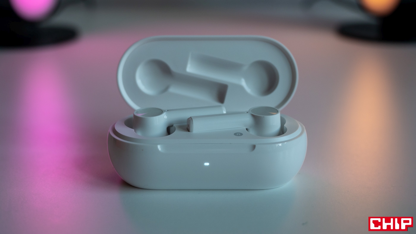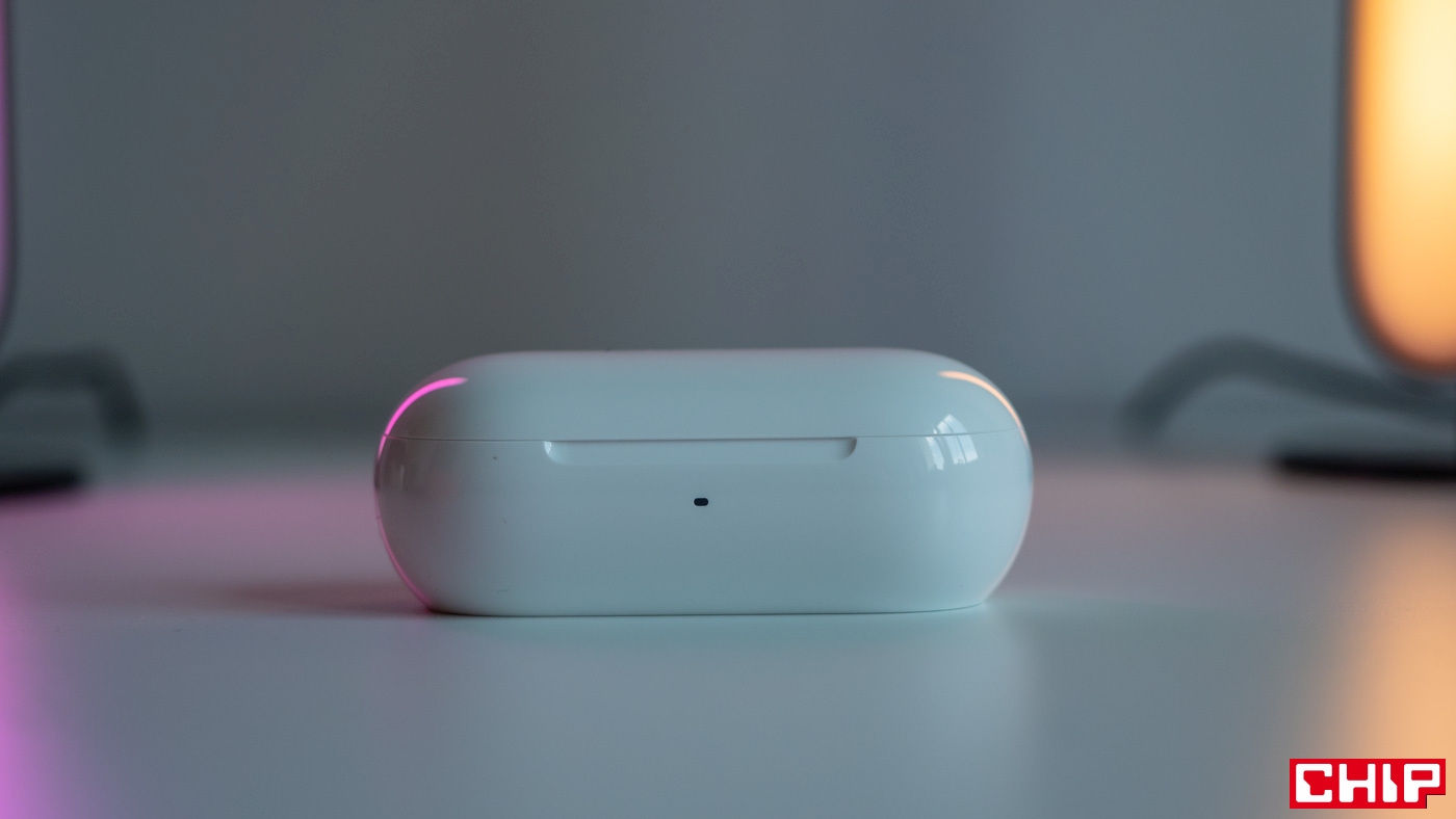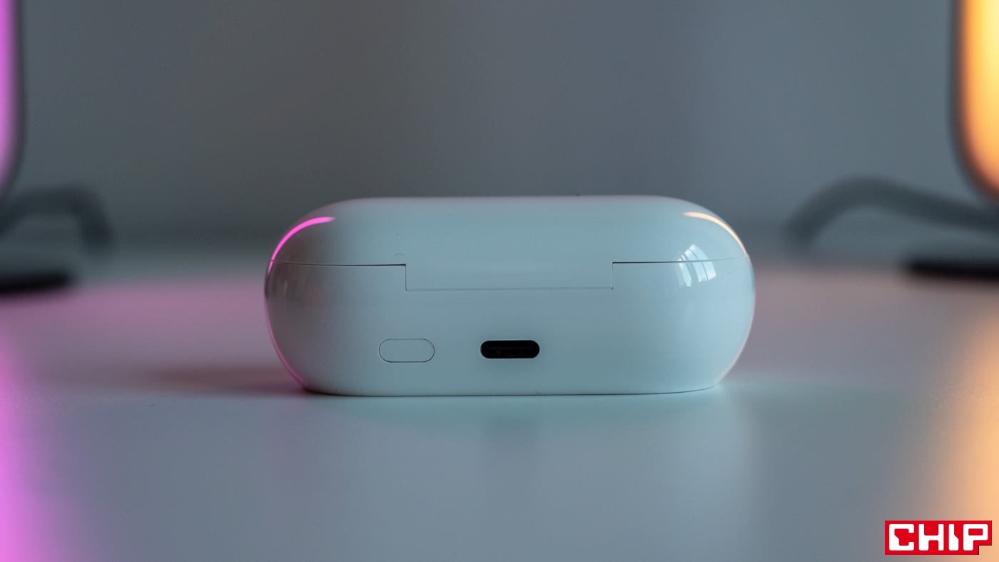 Ważące 40 gramów etui w formie szkatułki z obłym wierzchem okraszonym nazwą producenta i płaską podstawą nie jest specjalnie skomplikowane. Na wierzchu widzimy tylko diodę informującą o poziomie naładowania tuż pod wieczkiem z przodu oraz port ładowania USB-C w towarzystwie przycisku funkcyjnego z tyłu. Wewnątrz znajdują się tylko wnęki na obie słuchawki z magnesami oraz stykami ładującymi. Te łączą się z 450 mAh baterią w etui, która jednorazowo oddaje “z siebie” łącznie 80 mAh akumulatorkom w słuchawkach (po 40 mAh na słuchawkę).