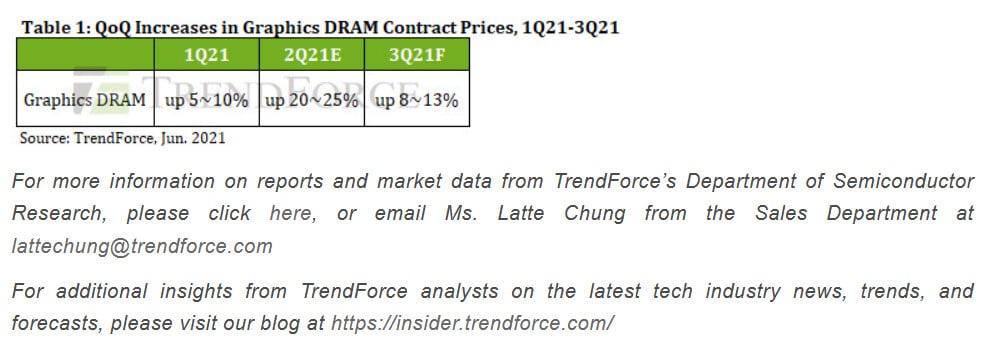 Teraz oczekuje się, że popyt ze strony górników na karty graficzne będzie stosunkowo stłumiony, a różnica między cenami spot a cenami kontraktowymi produktów graficznych DRAM prawdopodobnie zmniejszy się w trzecim kwartale 2021 roku. Jednak TrendForce spodziewa się, że cztery kluczowe czynniki będą nadal zwiększać ceny pamięci graficznych DRAM na rynku kontraktowym.