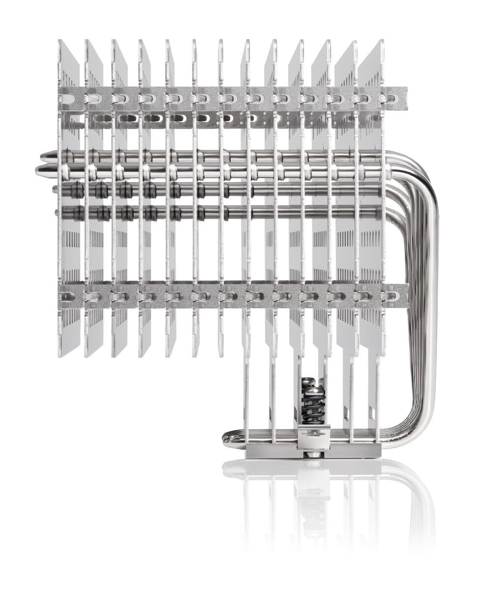Dyrektor generalny firmy zaznacza, że pasywne chłodzenie Noctua NH-P1, to nie tylko wielki radiator bez wentylatora. W rzeczywistości jego opracowanie wymagało “dużo pracy inżynierskiej” i widać to na pierwszy rzut oka, bo NH-P1 nie jest podobne do żadnego innego chłodzenia pasywnego na rynku. Wcale nie buduje go gęsto usłany żeberkami radiator, a interesująco rozłożone wzdłuż sześciu ciepłowodów 13 grubych płytek aluminiowych z prostokątnymi dziurkami.