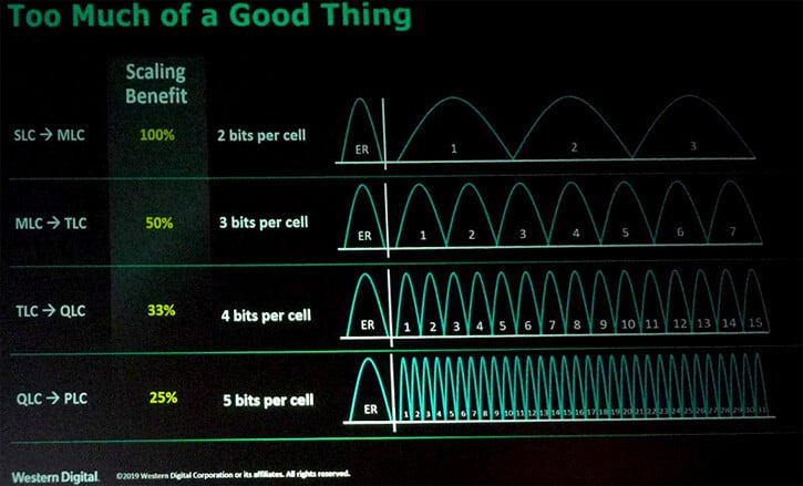 Nie jest bowiem tajemnicą, że tymi najwydajniejszymi i najwytrzymalszymi kośćmi były SLC, zdolne przechowywać tylko jeden bit na komórkę. W przypadku PLC każda komórka musi przechowywać jeden z 32 stanów napięcia, które z kolei informują kontroler o tym, jakie odpowiednie bity danych są tutaj przechowywane. Im tych bitów jest więcej, tym wytrzymałość (poziom TBW) i ogólna wydajność spada przez wyższe wymogi stawiane pojedynczym kościom pamięci. Z drugiej jednak strony PLC to szanse na niższe ceny i wyższe o 25% pojemności na komórkę.