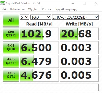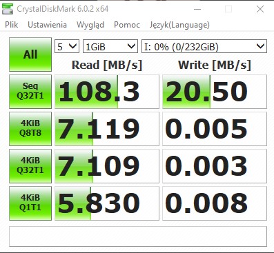 Bez względu na wybór możemy oczekiwać szerokiej kompatybilności, bo zarówno z USB 2.0, jak i 3.0 oraz 3.1, gdzie Attache 4, jak wskazuje sama nazwa, rozwija skrzydła. Producent obiecuje prędkości odczytu do 80 MB/s i zapisu do 20 MB/s, zachowując kwestię wydajności w losowych próbkach w tajemnicy. Nie jest to więc poziom SSD i nawet HDD, co potwierdza syntetyczny test, wskazując, że choć wydajność w rzeczywistości jest wyższa, to niecierpliwi od Attache 4 3.1 powinni stronić.