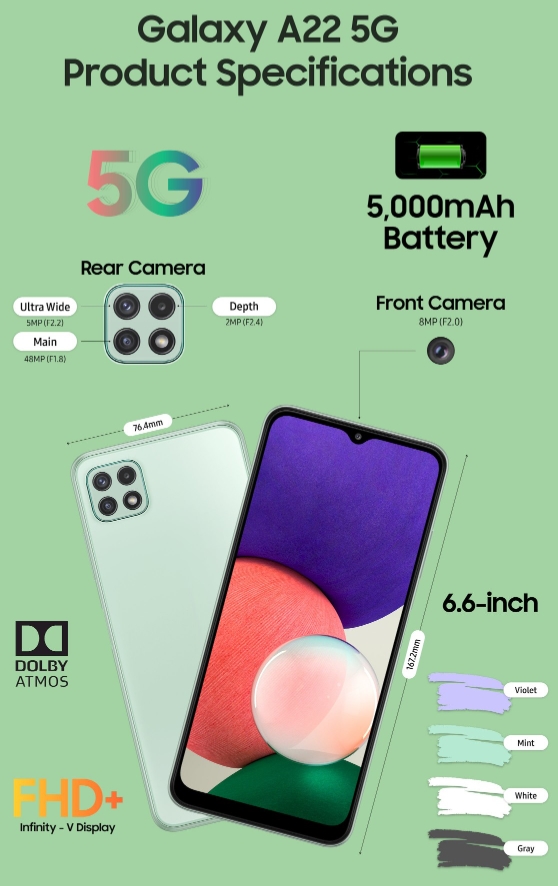 Galaxy A22 5G ma wymiary 167,2 x 76,4 x 9,0 mm, a jego waga wynosi 203 gramów. Na jego pokładzie nie zabrakło skanera linii papilarnych zamontowanego na boku, a to samo tyczy się wersji 4G. Jednak już za końcowy design odpowie jeszcze nasz wybór jego wersji szarej, białej, miętowej lub białej.