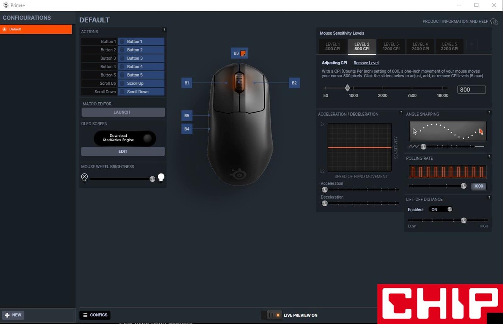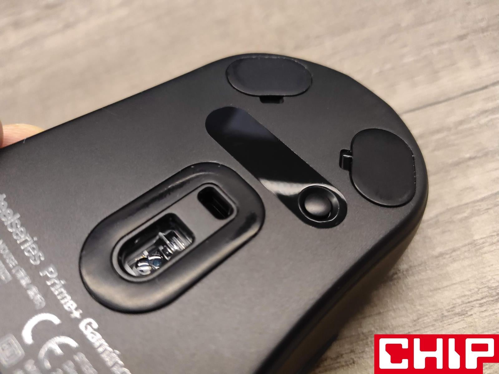 Zaczynając od fizycznego wyróżnika modelu Prime+, musimy udać się na spód myszki. To tam bowiem obok świetnych ślizgaczy, sensora TrueMove Pro+ i przycisku funkcyjnego znajdziemy mały panel OLED złożony Z 96 × 24 pikseli, które rozświetlają się wyłącznie kolorem białym. Dzięki temu panelowi możemy przeprowadzać wszystkie zmiany w ustawieniach myszy za pośrednictwem rolki i wspomnianego przycisku, a mowa tutaj o dostosowywaniu do pięciu poziomów DPI w zakresie od 100 do 18000 (skoki co 50 DPI), czułości sensora LOD, odświeżania (125, 250, 500, 1000 Hz), czy nawet podświetleniu.