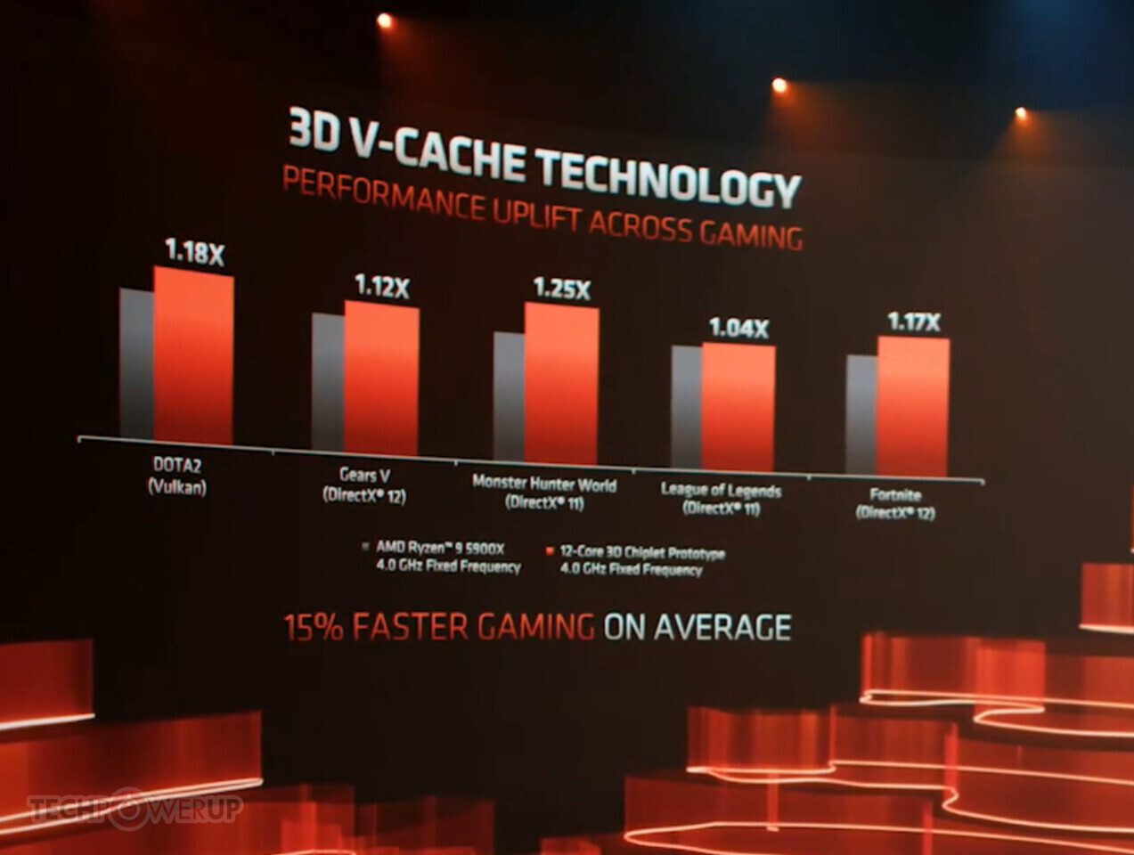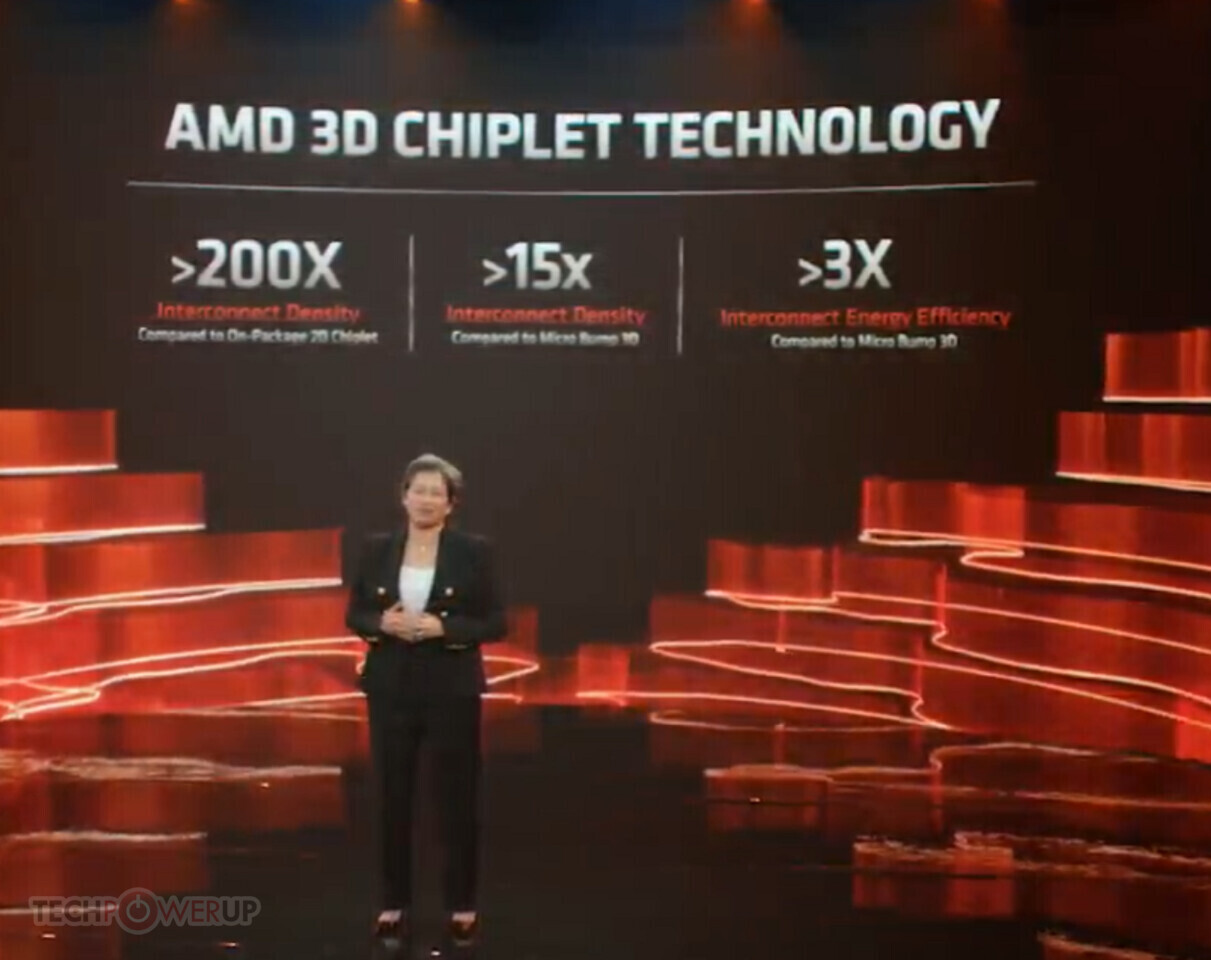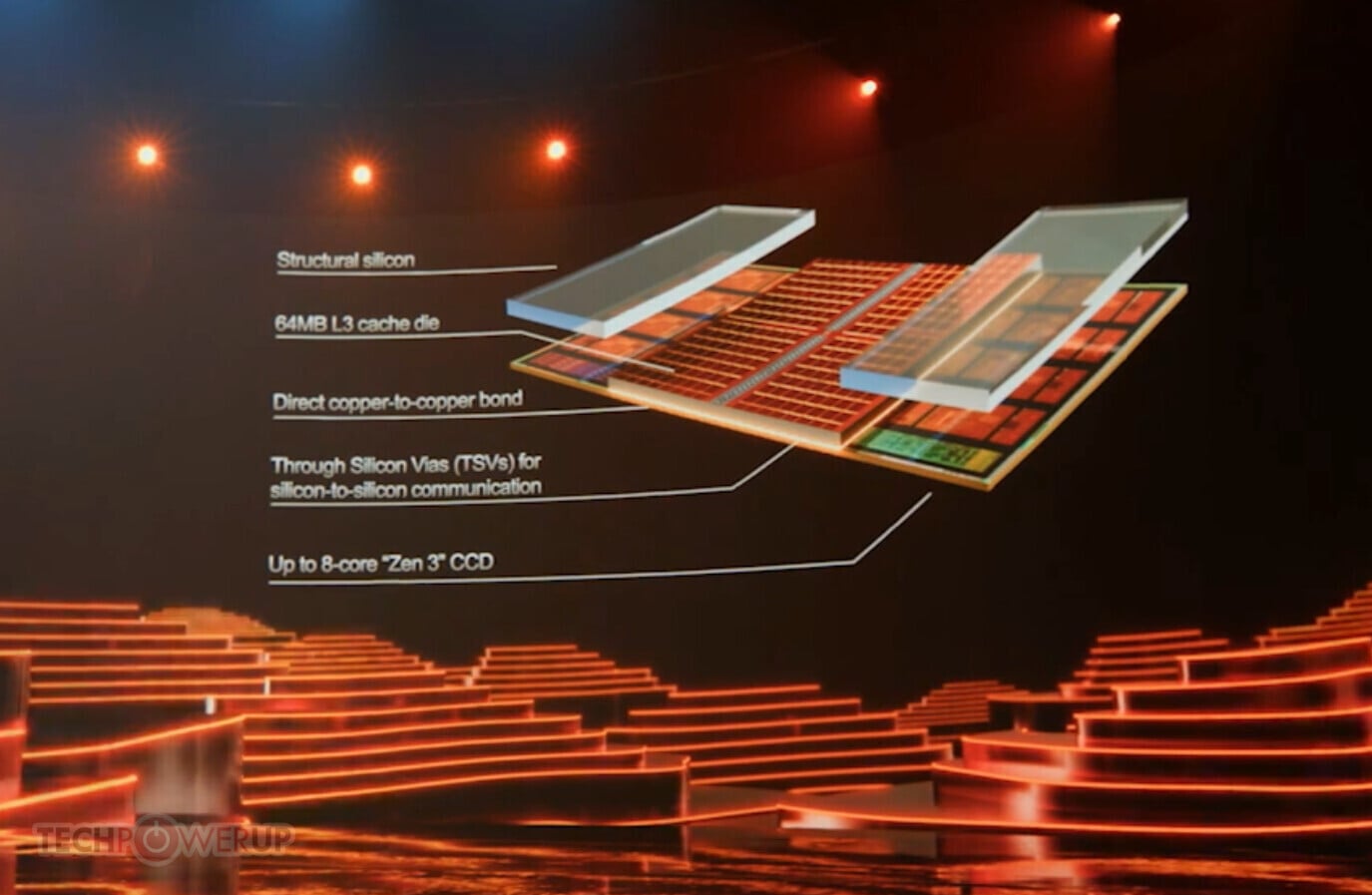 Wedle oficjalnych zapowiedzi AMD współpracowało z TSMC nad opracowaniem nowej technologii układania krzemowych układów w stosy typu “die-on-die” z wykorzystaniem TSV (przelotek silikonowych) i strukturalnego podłoża silikonowego, aby umieścić 64-MB układ pamięci podręcznej typu SRAM na standardowej matrycy CCD z Zen 3. W porównaniu do tradycyjnego podejścia AMD znalazło sposób na znaczące, bo (najpewniej) dwukrotne powiększenie pokładu pamięci podręcznej L3 (via TechPowerUp).
