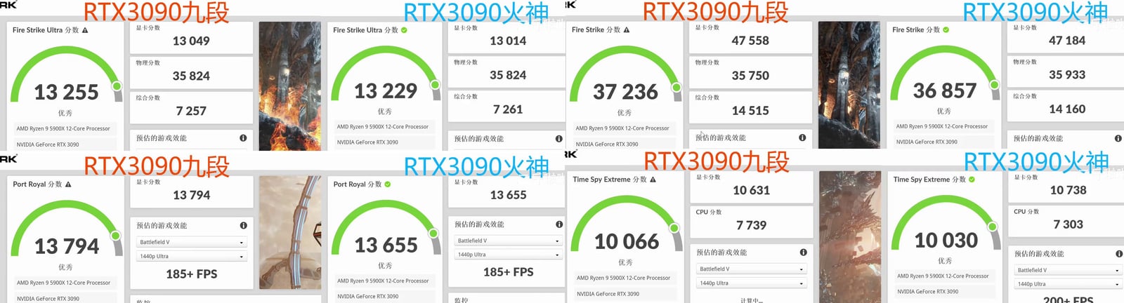 Przejdźmy może od razu do testów, bo te obejmują proste porównanie wydajności karty GeForce RTX 3090 Kudan do wydania RTX 3090 Vulcan. Wyniki rozróżnicie po tym, że ten pierwszy posiada pomarańczowy, a drugi niebieski napis i jeśli myślicie, że “źle patrzycie”, to muszę Was rozczarować – takie skromne wzrosty rzeczywiście wchodzą w grę i to pomimo TDP wyższego o 30W oraz zegara o 75 MHz, choć wedle cen MSRP Kudan jest droższy aż o 3000 dolarów.